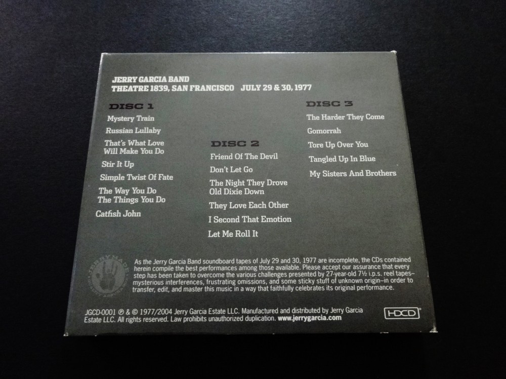 Jerry Garcia - Jerry Garcia Band : Pure Jerry 1 : Jerry Garcia Band : Theatre 1839 - San Francisco, California ( CA ) - July 29 & 30, 1977 ( 7/29/1977 & 7/30/1977 ) : 3 CD : Pure Jerry Series Volume 1 : 2004 (1977/2004) Jerry Garcia Estate, LLC - ( JGCD 0001 ) : " Inaugural ! " First ( 1st ! ) Pure Jerry Series Release ! : " Jerry Made Live Recordings " !!! The Inaugural ( 1st ! ) Installment of the Amazing ! " Pure Jerry " Series ( 2004 - 2009 ) - released in 2004 !!! 1977 Jerry Garcia Band recorded ' Live ' in San Francisco, CA !! - on the J.G.B. '77 Summer Tour !!! The Legendary ! " Theatre 1839 " 1977 Show !!!!! Jerry Fans !!! Arguably to many Garcia Band Fans this 1977 Tour was one of the Very-Best ! Jerry Garcia Band Tours of all time ( just on the heels of Jerry's studio album " Cats Under the Stars ! " - his personal favorite J.G.B. recording effort ) - featuring Jerry with John Kahn, Donna & Keith Godchaux, and Ron Tutt on Drums. A stripped down " Quintet " band version ( w/ only Donna Jean vocals ) of the J.G.B., basically allowing much-more Musical Space and Jam-Pockets for Jerry's Guitar Clarity - Ampage & Vocals. This 3-CD Set offers Amazingly-tight ! Musical performances during the J.G.B. 1977 Summer Tour ( July 29 & 30, 1977 ) - at Theatre 1839 in San Francisco ! Being a 3-CD release ( while other Volumes in this Series ranged anywhere from 1 to 4 CD's ), you could definitely make the argument that this ' 1st release ' here might have possibly been the Very-Best ! release overall - of the entire " Pure Jerry Series " ( 2004-2009 ). With of course, the Warner Theatre '78 release, and also Bay Area '78 - both obviously being in this conversation. 1976 - 1978 was the true coming of age period for the Jerry Garcia Band, and many view this 1977 Tour as the true-pinnacle - or even the " Prime ! " of this very-fine period in Garcia's Solo Career development. This 3-CD release features Absolutely-Pristine ! & Quintessential !! Jerry Garcia Band 1977 Shows - and is one of the very-best Jerry Garcia pro-releases to date. Completely-Incredible !!! Enjoy !!!!! TRACK LISTING >>> Jerry Garcia Band recorded ' Live ' at Theatre 1839 - in San Francisco, California ( CA ) on July 29 & 30, 1977 ( 7/29/1977 & 7/30/1977 ) : DISC 1 : Mystery Train Russian Lullaby That's What Love Will Make You Stir It Up Simple Twist of Fate The Way You Do You Do the Things You Do Catfish John DISC 2 : Friend Of The Devil Don't Let Go The Night They Drove Old Dixie Down They Love Each Other I Second That Emotion Let Me Roll It DISC 3 : The Harder They Come Gomorrah Tore Up Over You Tangled Up In Blue My Sisters And Brothers Item Condition : This Rare Out of Print ( 2004 Jerry Garcia Estate, LLC release ) Jerry Garcia Band Pure Jerry 1 ( Theatre 1839 - San Francisco, CA - July 29 & 30, 1977 ) 3-CD Set is in Good condition - close to Very Good overall. CD's ( Disc One, Disc Two, Disc Three ) are in Very Good condition - close to Very Good/Like New with light marks on the playing surfaces (please see photos). CD Case ( 3-CD Quad Fold ) is in Good condition - close to Good/Very Good with light-medium edge/surface wear (please see photos). Please see all photos provided. Photos included are of the actual item you will receive. Summer '77 J.G.B. in San Francisco !!! ... One of the Very-Best ! Garcia releases of All-Time !! - Pure Jerry # 1 !!! - Enjoy !!!!! Please ask any questions before bidding/buying & Best of Luck ! ( also ... please feel free to click the 'see other items' button above to check-out my other related live listings - Thanks ! ) U.S. & International buyers welcome (additional shipping charges & delivery time will apply for international destinations). Shipping charges include delivery confirmation on every item. Returns accepted within 14 days of purchase if item is returned unused & undamaged (buyer pays return shipping). All items will be shipped as merchandise with the winning bid entered as item value (2025-2026).