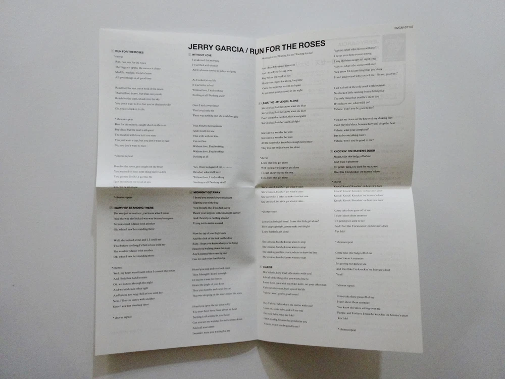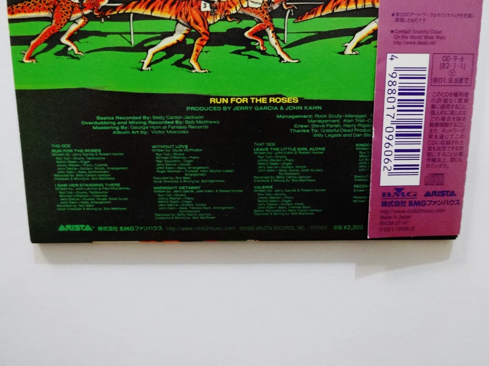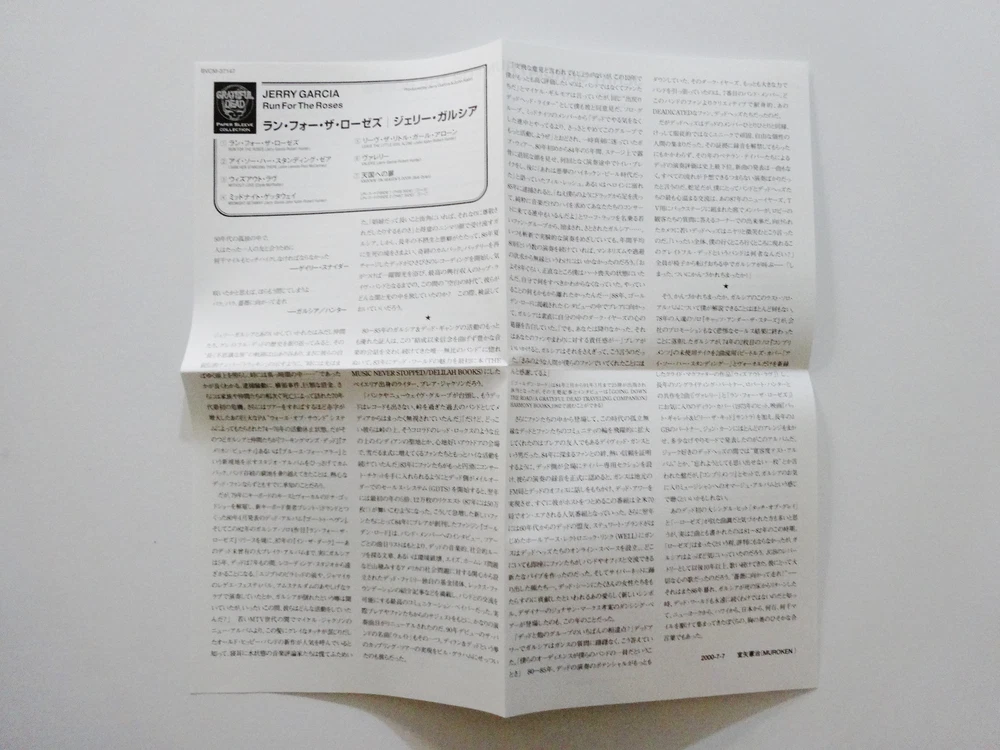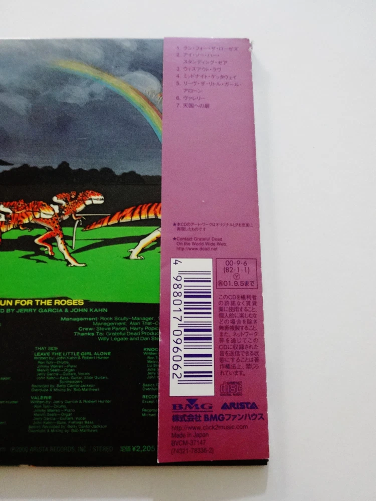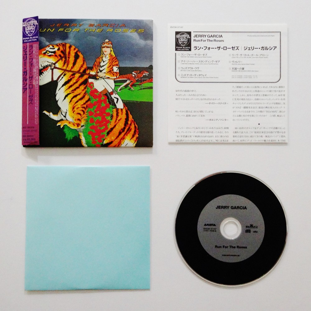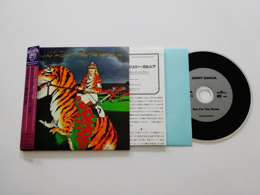 Jerry Garcia - Run For The Roses - 1982 Studio Album ( CD ) - Japan Issue / Japanese Import - Grateful Dead Paper Sleeve Collection - 2000 Arista / BMG (1982/2000) - BCVM-37147 1982 Jerry Garcia " Run For The Roses " Studio Album Musicians - ( Jerry Garcia / John Kahn / Ron Tutt / Melvin Seals / Merl Saunders / James Warren / Michael O'Martian / Michael Neuman / Liz Stires / Julie Stafford ) Recorded September 1981 to December 1981 ( released in November 1982 ) Produced by Jerry Garcia & John Kahn Complete Song Lyrics Sheet included - in Japanese & English Made In Japan ( Japanese Import ) - " The Grateful Dead Paper Sleeve Collection " ( Arista / BMG ) Good condition ( medium-heavy scratches on CD / light surface wear on CD case & attached ' paper sleeve collection ' tag / near mint-mint lyrics sheet quad-fold insert / near mint-mint inside paper CD sleeve case / CD plays perfect )
