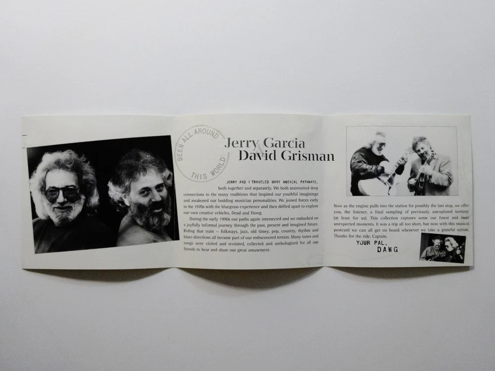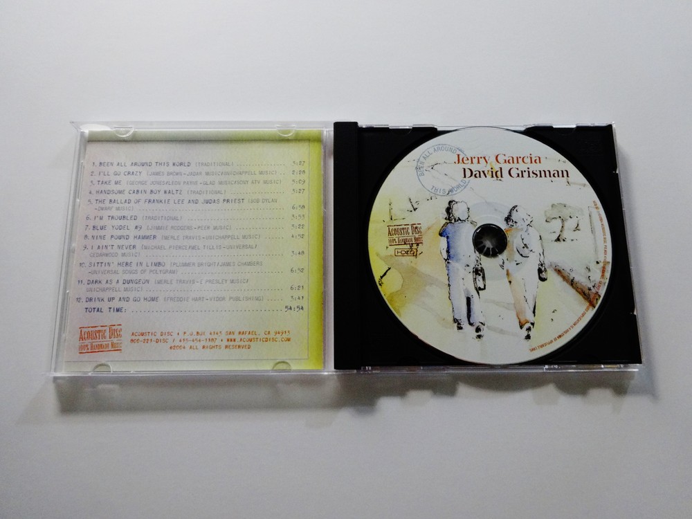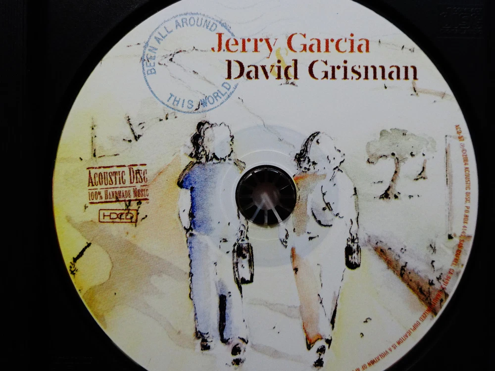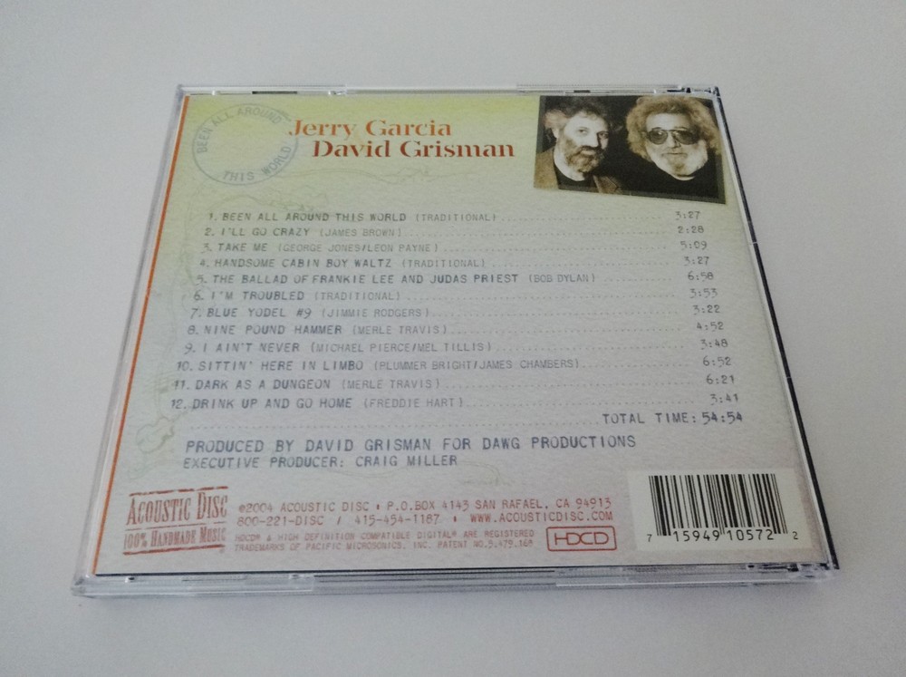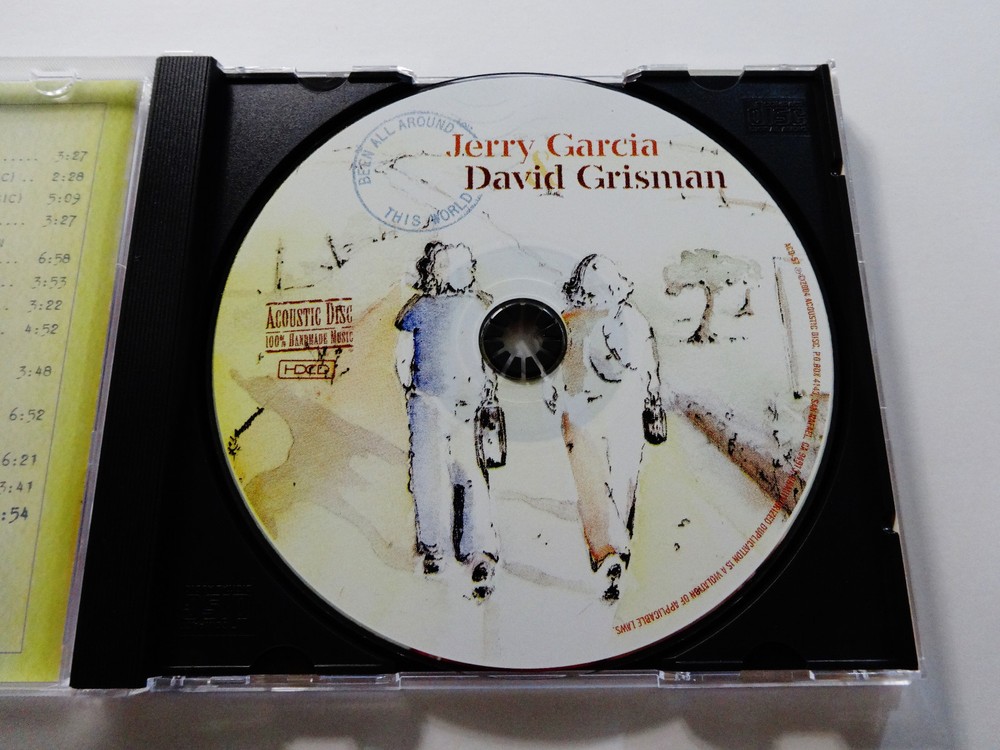 Jerry Garcia - Jerry Garcia & David Grisman - Garcia / Grisman - Been All Around This World - Early 1990's Studio Sessions Recordings ( Dawg Studios ) - American Music Acoustic - CD - 2004 Acoustic Disc ACD - 57 Garcia & Grisman ( Jerry Garcia ( Grateful Dead / Jerry Garcia Band ) & David Grisman ( David Grisman Quintet ) ) - Early '90's Studio Sessions Recordings at Dawg's ( David Grisman's ) Home Studio Early 1990's Jerry Garcia & David Grisman Acoustic Studio Recordings - Recorded at David Grisman's Home Studio ( Dawg Studio ) in Mill Valley, California CA Sessions include musical contributions from Jerry Garcia & David Grisman - plus Joe Craven - Jim Kerwin - Matt Eakle - John Kahn - George Martin - Sally Van Meter Good condition ( medium-heavy scratches throughout CD / indentations on liner notes / near mint-mint CD case / CD plays perfect )