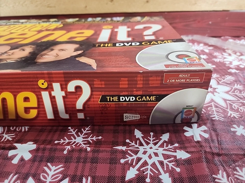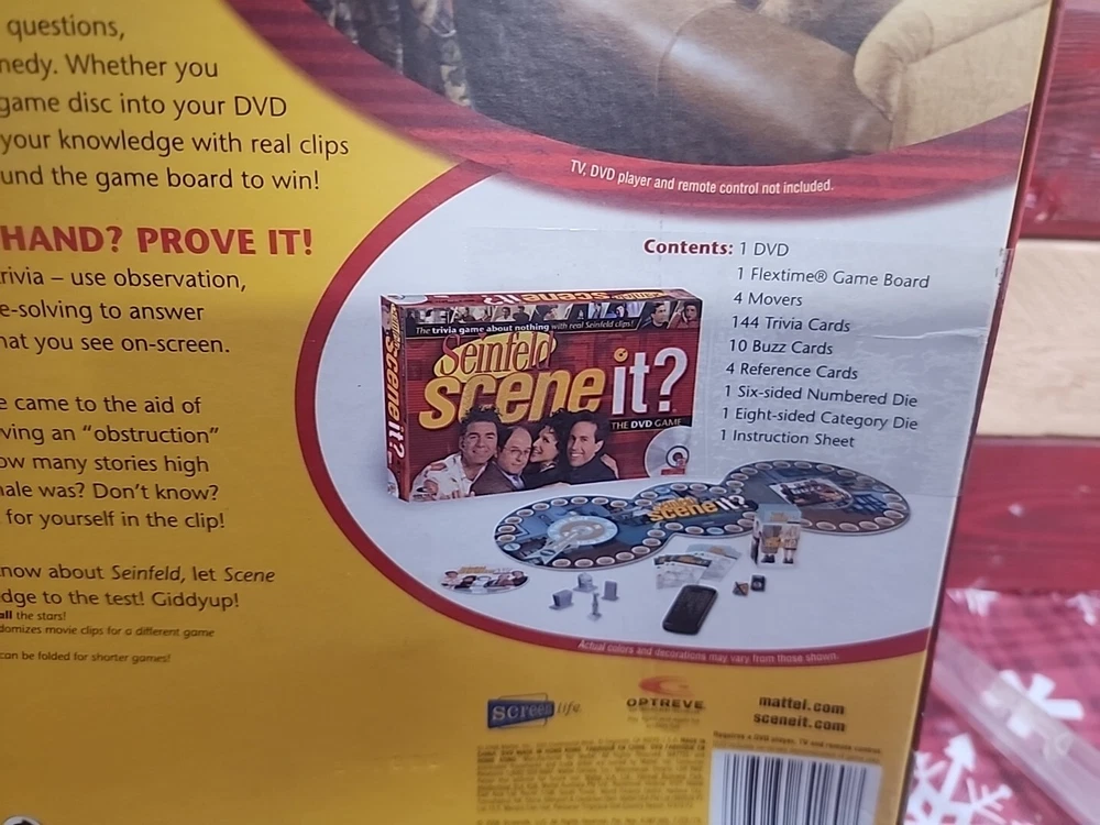 Get ready to put your Seinfeld knowledge to the test with this factory-sealed DVD game. With Jerry Seinfeld as the host, Scene It? The DVD Game is a complete board game that includes a DVD with over 1,000 questions about the beloved TV show. The game is perfect for adults and includes players aged 8-11 years old. The game features questions from all seasons of Seinfeld and includes a Christmas gift. This Mattel-produced game is an excellent addition to any Seinfeld fan's collection. Buy now and see if you can answer all the questions correctly!