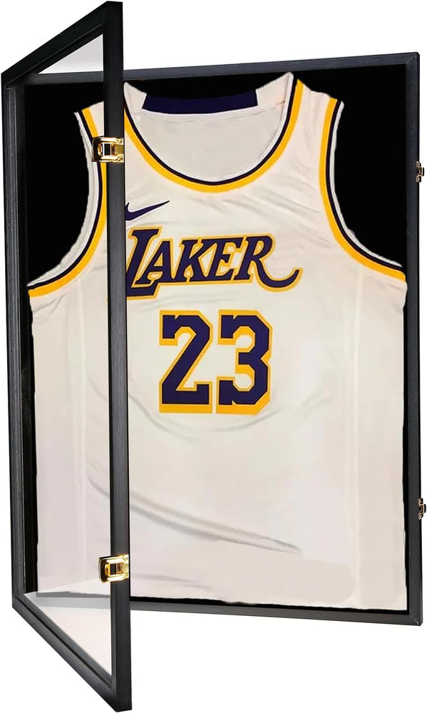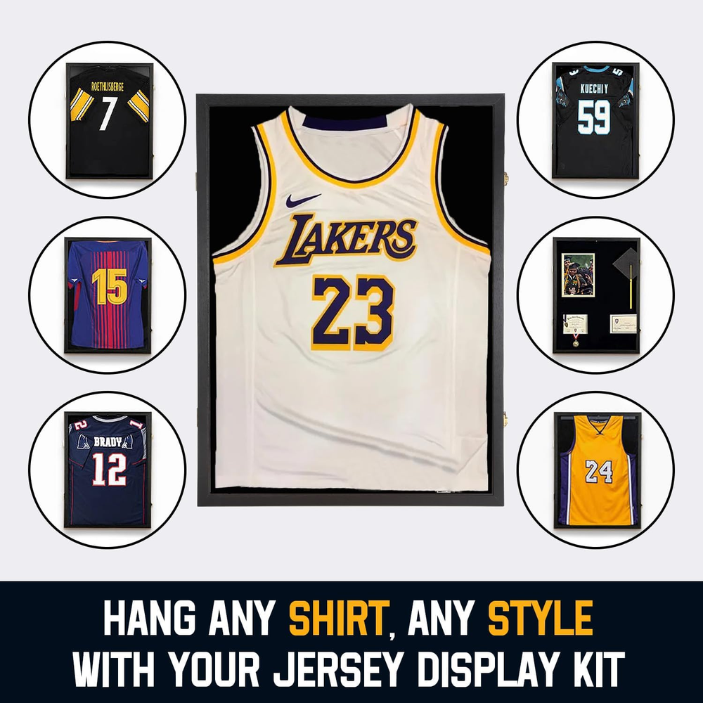 Engineered Wood One Size Fits All- Large size display frame of 31.25" x 23.25" x 1.5" fits most sports jerseys,Make it a perfect gift for sports fans! It can also be used as a shadow box to display military uniform, graduation memorabilia and other cherish memories. Three Ways To Display-Two style wooden hangers is perfect for hanging your sleeveless commemorative jersey. The Pin board is great for stretching out your short or long-sleeved jersey.(Note:Jersey not include) Multi-Function Display Case- You can display your Hockey Baseball Basketball Football Soccer Tennis Marathon Sport Shirt,or military uniform,t-shirt,baby souvenir clothes,graduation memorabilia and other cherish memories. Great Gift Ideal For Sport Lovers-Football jersey frame really a great gift for jersey enthusiast to well display their t-shirt and Collector Autograph jersey and show them to their family and friends. And it is also a stylish decoration for home and office.Jersey display frame can be a gift for Christmas, Valentine's Day, Thanksgiving, Veterans Day. PROTECT COLLECTIBLES-jersey frames won't turn yellow over time and always offer ultra clear viewing.One size fits all sports jersey of baseball, basketball,football,soccer,hockey,jerseys. The large show box can display flag,uniforms, graduates items, sports souvenirs,collectibles and memorabilia. Product description