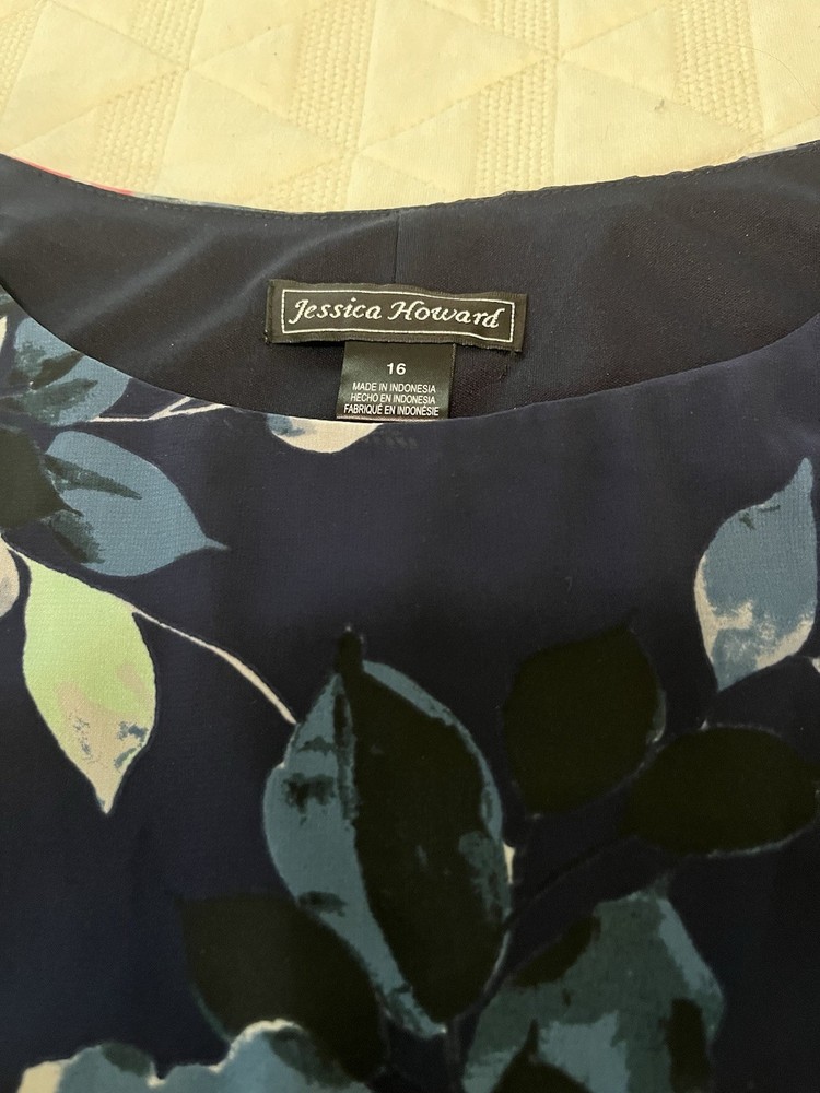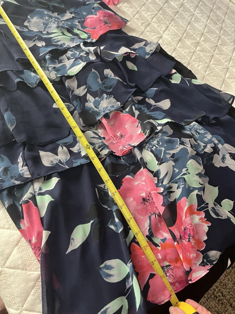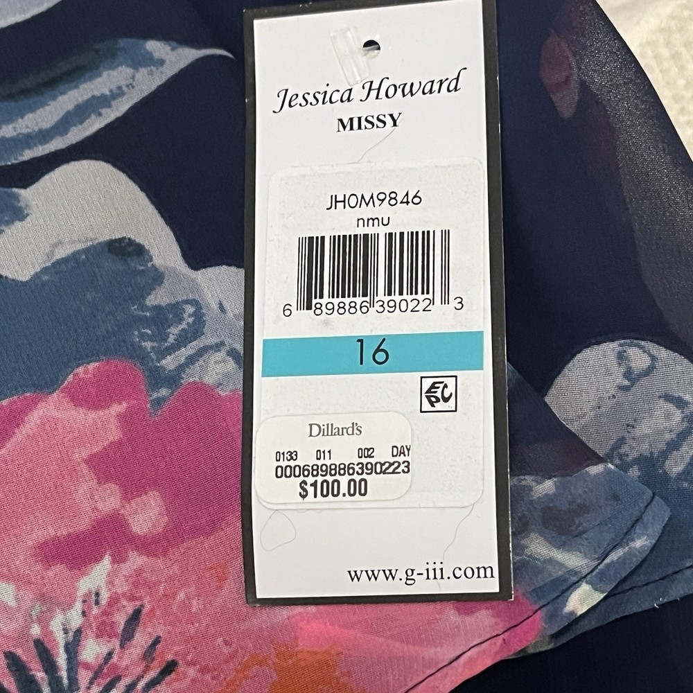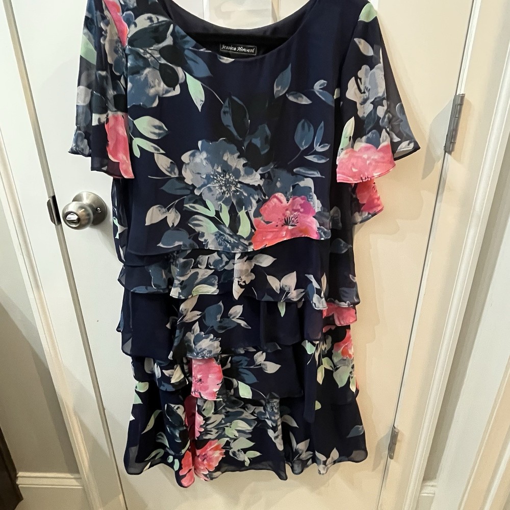 The Jessica Howard Women's Navy and Pink Floral Layered Chiffon Dress is a stylish option for a wedding or party. Made from polyester chiffon, this knee-length dress features a flattering fit and flare style with a round neck and short sleeves. The dress is accented with layers for added dimension and has a zip closure. The navy blue color and floral pattern add a touch of elegance, making it perfect for the summer and spring seasons. This dress is designed for a size 16 regular fit for women who want to make a statement at a special occasion.