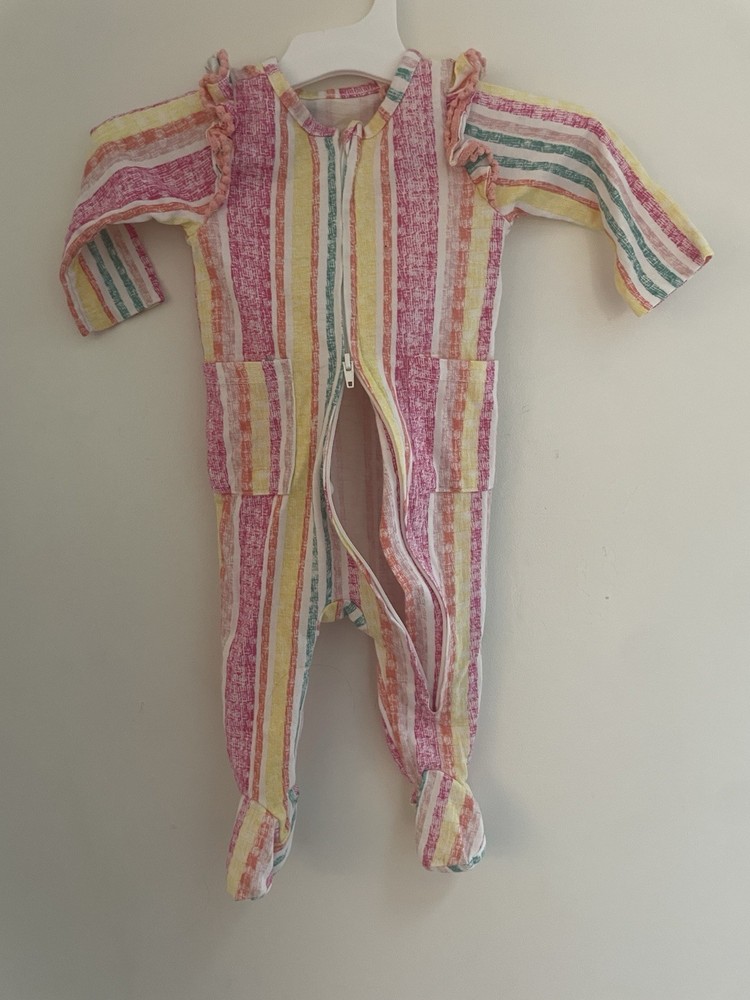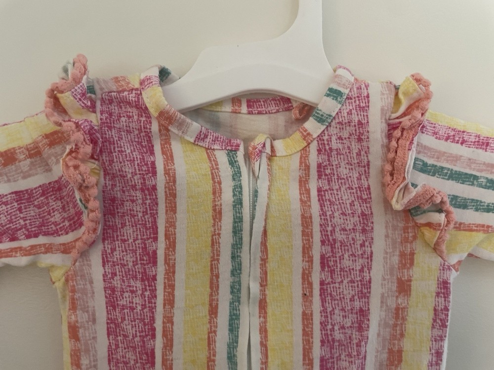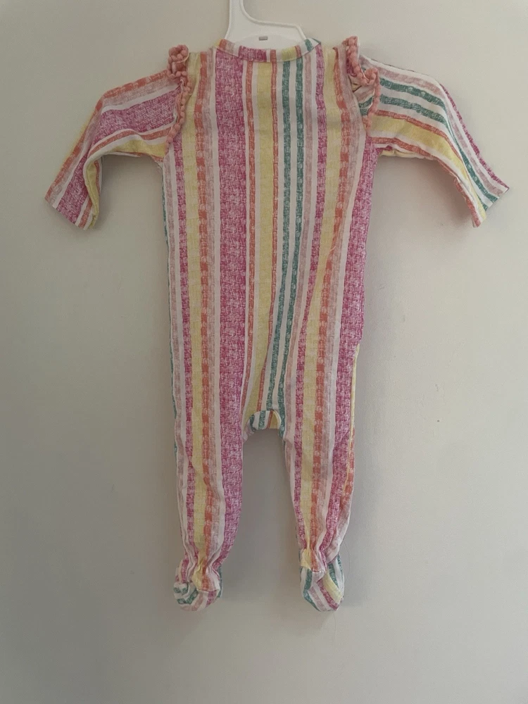 Jessica Simpson Baby Girls Colorful Rainbow Striped Ruffle 1-Piece Multi 3/6M. Condition is pre-owned. Smoke free, pet free home. Shipped via USPS Ground Advantage. In very good condition. Free of rips or stains.