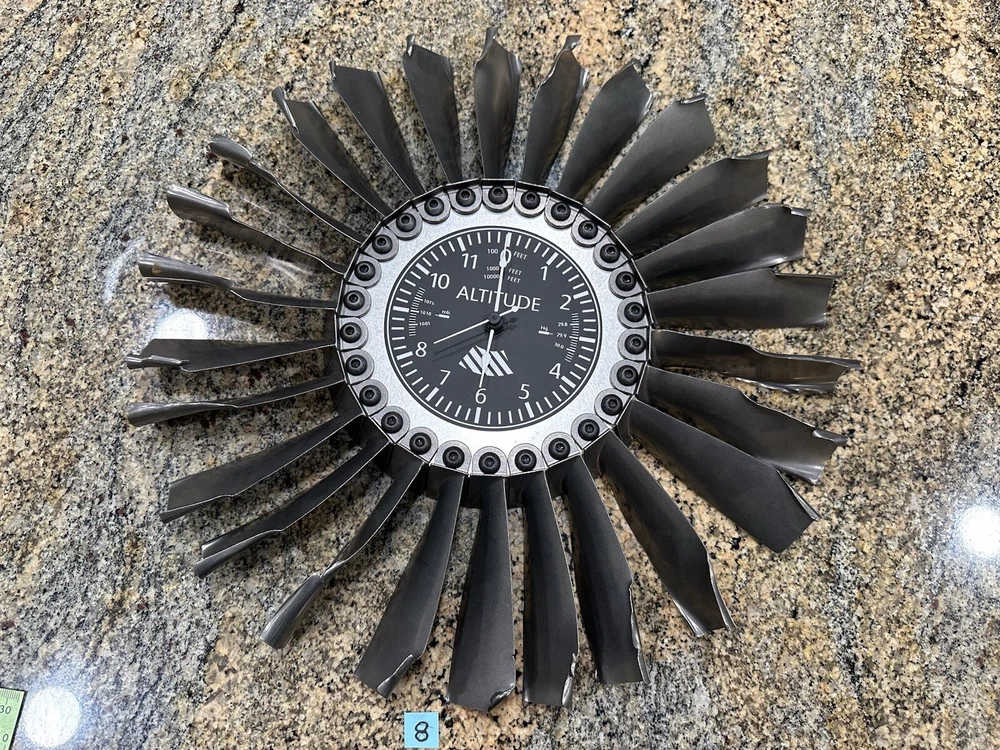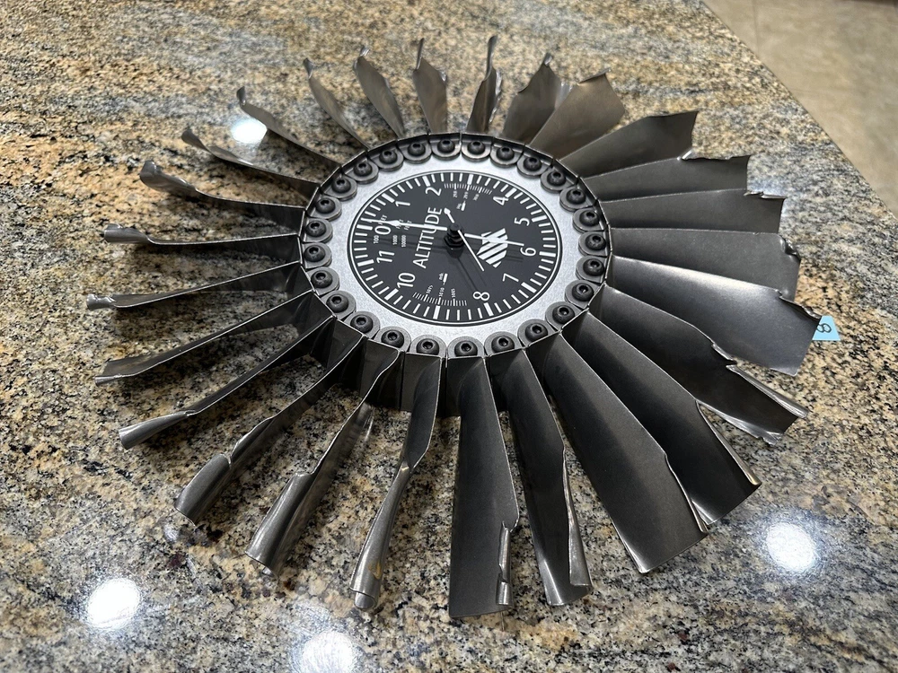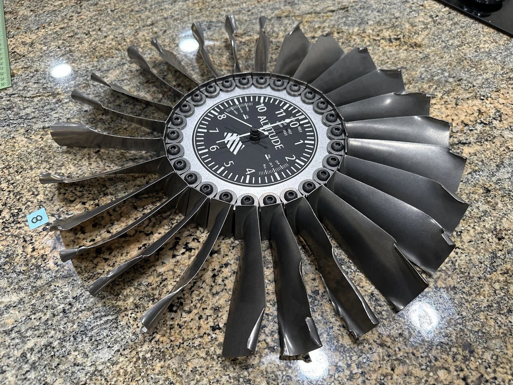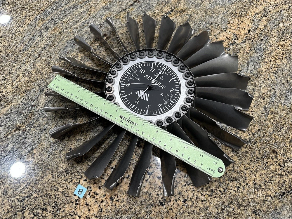 This is a clock made using FOD damaged blades from USAF F-5 and T-38 jet engines. Clock measures about 14 inches in diameter.