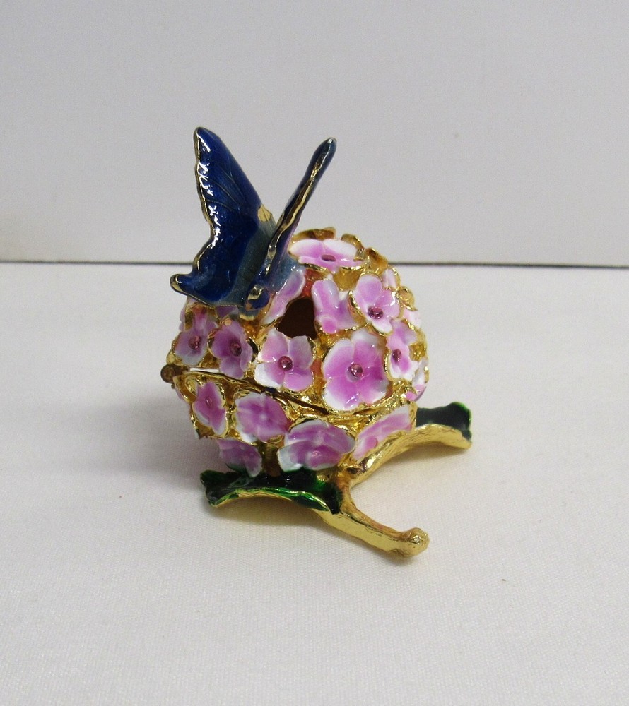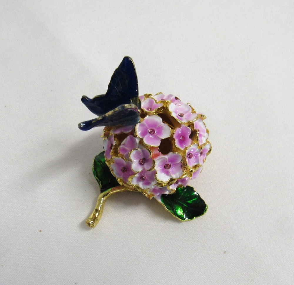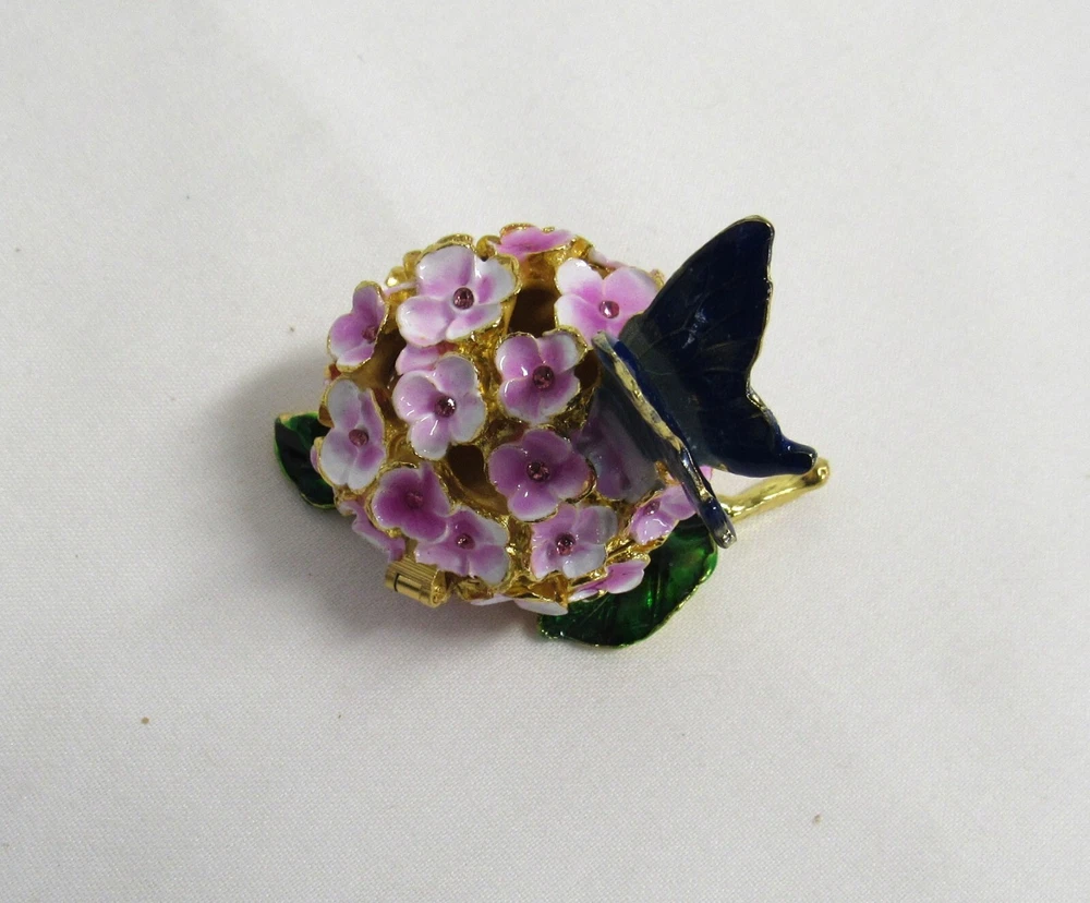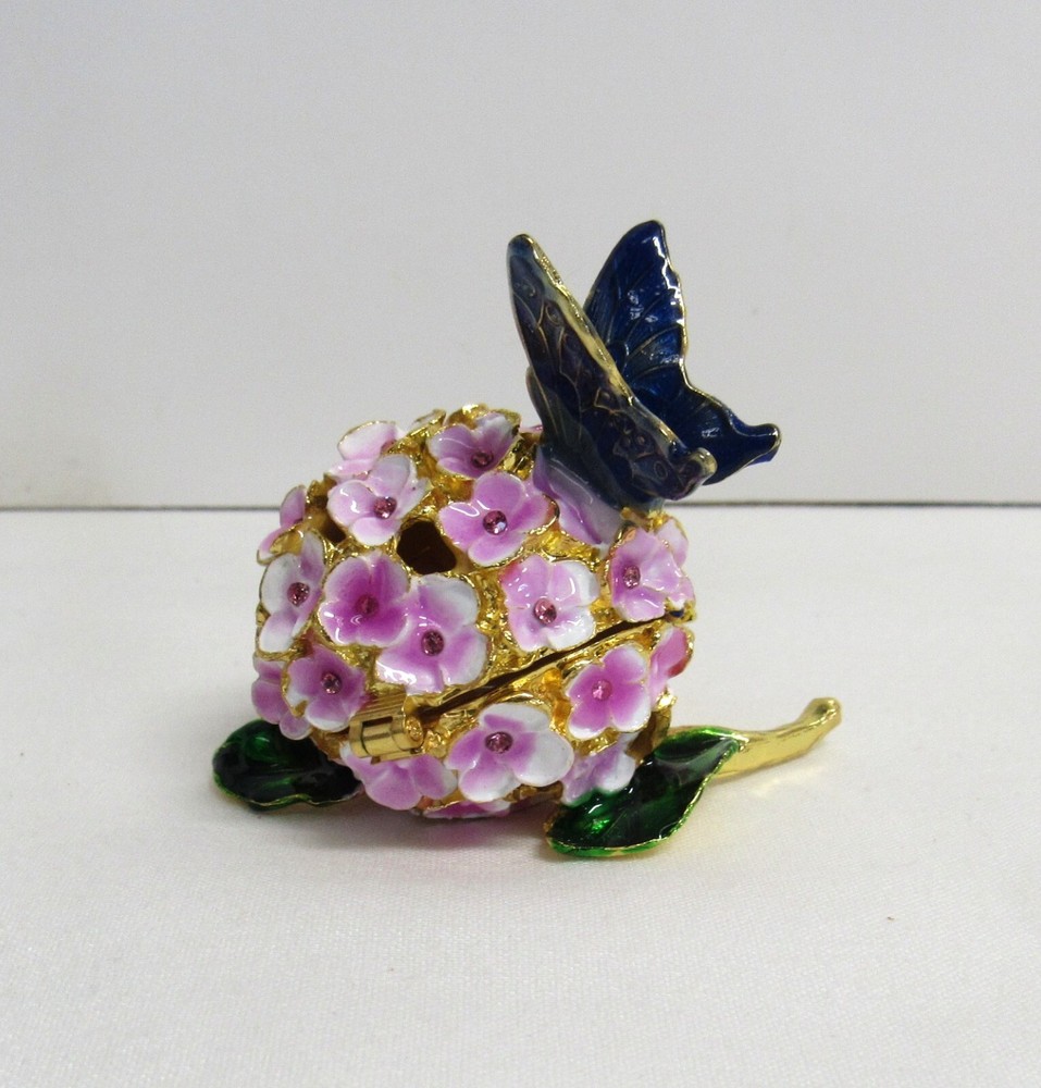 Jeweled Butterfly and Flower Enamel Rhinestone Hinged Trinket Box - EUC Hand Painted, Jeweled Flower w/Butterfly, Hinged Trinket Box with Magnetic Closure. This item is 2 inches high, 1 3/4 inches wide, 2 inches deep, in Excellent Used Condition. This piece is 3 1/2 inches deep when opened. Perfect addition to your Keepsake Box collection, and also makes a lovely gift to someone special. Ships via USPS Ground Advantage for flat amount . - Please review all pictures as these are part of the description of this item - Please pay for item within three days of purchase - Feedback is highly appreciated - Message me with any questions