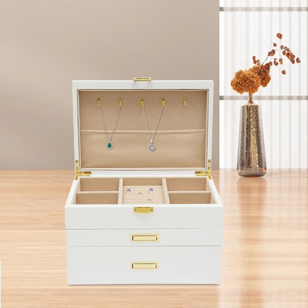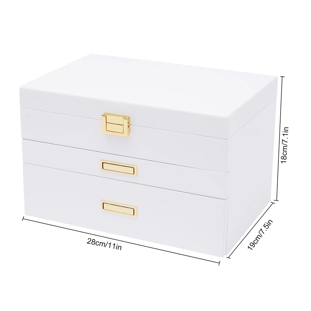 Jewelry Case Jewelry Box Box Gifts Box with 2 Drawers White for Storage Earrings Description Is your fine jewelry still piled up on the vanity cabinet with dust? Are you still worried that you can't find the jewelry you want when you go out in a hurry? This beautiful and practical jewelry box can solve all your troubles. The three-layer storage design allows you to store many different kinds and sizes of jewelry, and helps your jewelry and tabletop keep clean and beautiful! It will be a unique organizer for all your beautiful jewelry! Key Features Rational Layout: Depending on the size of your everyday jewelry and its characteristics, this jewelry box is designed with compartments of different sizes, as well as special necklace hangers, ring rolls, and watch compartments with removable pillows for more secure storage, display, and selection of your jewelry. Full Pull-out Drawer: The full pull-out drawer design is convenient for displaying and accessing all jewelry, and you can also rearrange each drawer according to your usage habits. Elegant Appearance : The classic white jewelry box with lustrous metal handles showcases its nobility, elegance, and style. It complements your noble temperament while adding elegance to your dressing table. Sturdy and Durable : Our jewelry box is made of high-quality density board with a painted exterior that is waterproof, wear-resistant, impact-resistant, and long-lasting, as well as very sturdy to provide good support and stability. Large Capacity : This large size (11*7.5*7.1in) jewelry box is designed with three layers to give you plenty of storage space. With this large-capacity jewelry organizer, your various jewelry will have a warm and spacious home. Great Organizer: This jewelry box will keep all your jewelry well organized, neatly displayed, and safely stored. The unique drawer design and lid provide excellent water and dust resistance for jewelry. Ideal Gift: This jewelry box has a unique design with a beautiful appearance and a large capacity with practical features. It is an ideal gift for Valentine's Day, Mother's Day, Thanksgiving, Christmas, birthdays, and weddings. Ready to Use : This 3-layer jewelry box can be used directly without extra installation, saving your time and energy. Easy to Clean : It has a painted finish to make it easy to clean. You can easily remove dust and stains from it with just a damp rag. Customer Service: We aim to provide quality products and services. If you have any problems, please feel free to contact us. We will reply and solve the problem for you as soon as possible. Details Plush Lining: The jewelry box is designed with a plush lining that not only gives you a comfortable touch but also protects your jewelry from scratches and crushing so that your precious jewelry will be well cared for until the next time you use it. Anti-slip Pads: It has non-slip pads on the bottom for more stable placement. It also prevents the table from being scratched. Necklace Hook: The cover is specially designed with 5 hooks for the necklace, which can better display the necklace and prevent it from knotting. A pocket is also designed below the hook to fix the necklace or store other items. Premium Hardware: The gold hardware of this jewelry box is electroplated for color fixation, which makes it glossy and textured, and also prevents corrosion and rusting. Attractive Design Handle : The hidden handle design is both beautiful and practical. When you need to use it, you just need to press the right end of the pull with your thumb, and then the left end will be raised for successful pulling out of the drawer, which is an innovative and stylish design. Application It is suitable for organizing various jewelry including sunglasses, watches, hairpins, earrings, rings, bracelets, watches and necklaces. Specifications Material: Density Board, Hardware Hardware Process: Electroplated Process: Painted Lining Material: Plush Color: White Style: Modern Number of Layers: 3 Shape: Rectangular Mounting Type: Free-standing Watch Compartment Size: 5*8.5cm/2*3.3in Second Layer Smaller Compartment Size: 4.3*4.8cm/1.7*1.9in Second Layer Larger Compartment Size: 3.5*15.5cm/1.4*6.1in Packing Size: 34*25*25cm/13.38*9.84*9.84in Product Size: 28*19*18cm/11*7.5*7.1in Gross Weight: 3.2kg/7.05lbs Net Weight: 2.8kg/6.17lbs Package Included 1* Jewelry Box Notes Please allow the slight color difference caused by the shooting light and 1-3cm error due to manual measurement, and make sure you do not mind before you order. Payment Delivery details Terms of sales About us Contact us Payment We accept ebay payment 。 Fees such as import duties, taxes are not included in the item price or shipping costs. These charges are the buyer's responsibility. Delivery details Shipping: 2-9 working days to: USA Terms of sales We maintain high standards of excellence and strive for hundred percent customer satisfaction. Feedback is very important to us. We hope that you contact us immediately before you give neutral or negative feedback, so that we can address your concerns. It is impossible to address issues if we do not know about them! About us Your satis faction is our ultimate goal. We work hard to earn your trust and future business. Our certified technicians have tested each item before shipping. The unit comes with 1 year limited warranty on all manufacturing defects. a) If you receive a defective item, you may return it or ask for a discount. Please contact us within 14 days after you receive the package. b) What you returned must be intact and in its original packaging as re? u. Customer is responsible for shipping costs of the returned item. c) We will cover the cost of shipping back t with the shipping rate indicated in the registration page. We will send you a new unit or refund the full payment you paid. Thank you. Contact us Business Hour Business Hour: Monday To Friday: 8:30 AM to 5:00 PM (Beijing China time) Due to time zones, our reply to your questions may