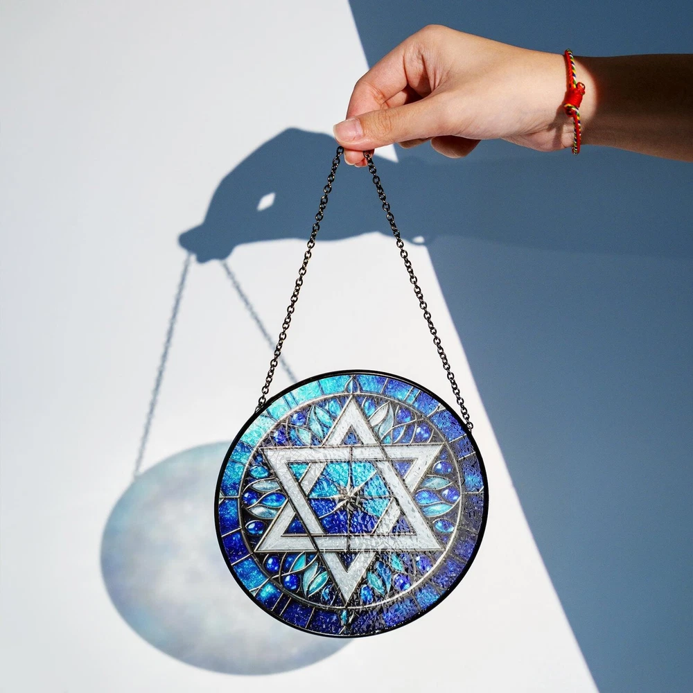 Jewish Star Of David Glass Suncatcher Jewish Menorah Window Hanging Hanukkah Art Decor Hanukkah Suncatcher Jewish Festival Home Decor Bring vibrant color and dazzling light into your home with our beautifully crafted Stained Glass Suncatcher. Designed to captivate and built to last, this eye-catching, elegant, classic piece will elevate any room with ease and add a unique focal point to any interior. Material: High-grade 0.5-cm thick glass. The material is sturdy with a unique texture, offering clarity and durability that stands the test of time. A combination of textured and smooth surfaces on two sides creates a mesmerizing, dynamic dance of light and color, turning any window into a brilliant display of elegance and beauty. Vibrant, long-lasting prints with special matte coating ensure the colors stay vivid and vibrant, even with years of exposure to sunlight. Zinc strips are reinforced around the glass for extra strength and durability, protecting the glass from breaking under impact or outside force. Integrated hooks with a sleek black metal chain and a sucker cup are available for easy and instant installation in any window or desired spot. Available in two sizes: 6-inch or 7.8-inch sizes to perfectly complement your space. Easy to clean surface remains looking fresh and new regardless of time. Safe and Secure Packaging: Your suncatcher will arrive carefully packaged in foam, ensuring it’s in pristine condition and ready to brighten up your home.