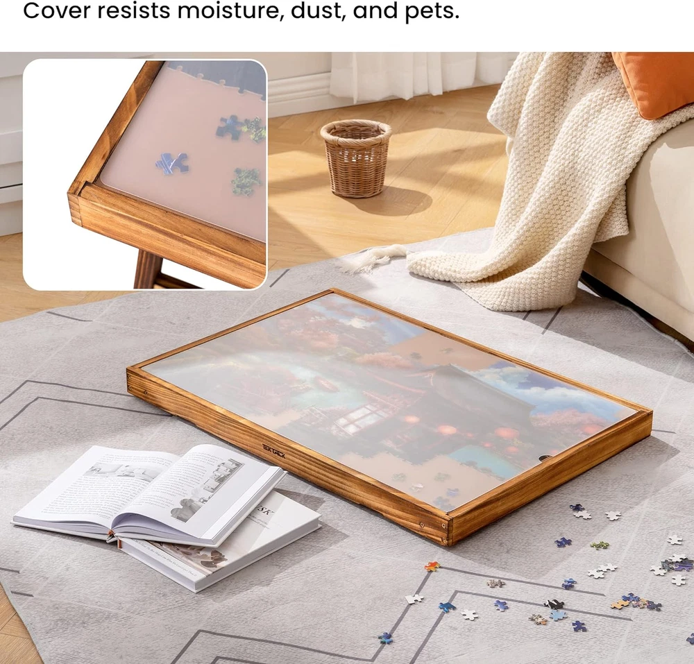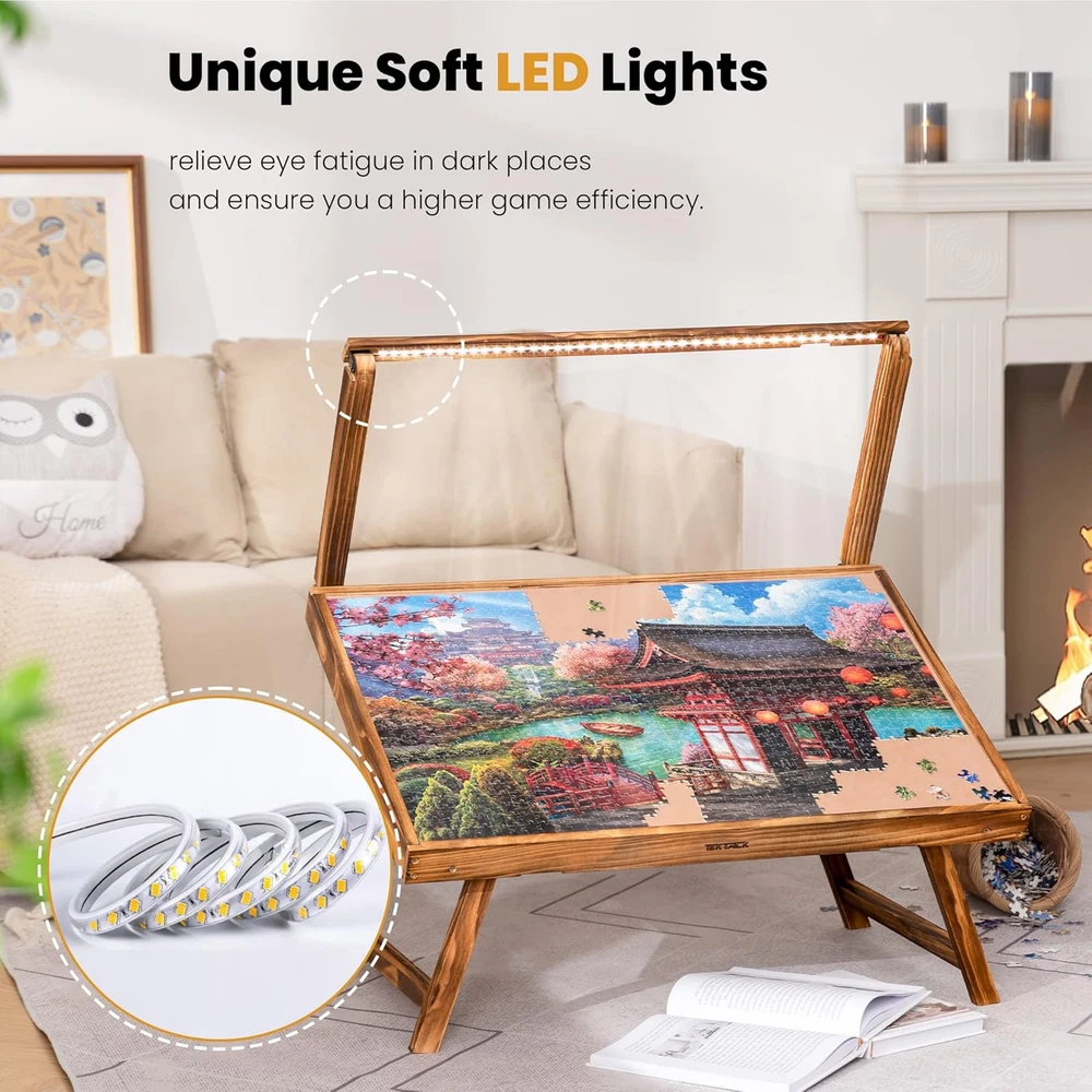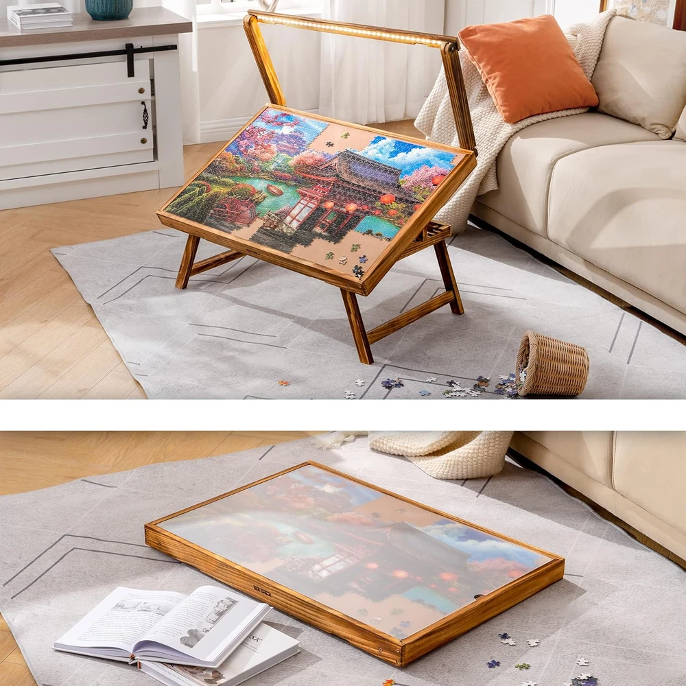 Unique Adjustable Light Bar - Our puzzle table is designed with LED beads featuring soft natural light, which helps to alleviate your visual fatigue when playing puzzle games in a dark environment. The angle of the light bar is adjustable, which ensures you a comfortable position (3 AA batteries are needed, not included). Besides serving as a puzzle table, it can also be a delicate and unique ambience tool. It is an ideal choice for playing jigsaw puzzles, reading, and crafting. PP Cover - A thickened PP cover is enclosed to resist dust and water, and to stop naughty pets from messing with your unfinished puzzle game. 5 Angle Adjustments - 5 angle adjustments are available from 0° to 30°. There is always an ideal angle to relieve pressure and fatigue on your neck, waist and back. You can thus be more focused on your game. Easy To Store - Coming with foldaway legs and retractable light bar, this puzzle table is light enough for you to move your unfinished game anywhere you like. When you want to pause and save the game, just fold it up and store it under the couch or bed. Thoughtful Design - Our puzzle table is processed out of premium natural wood material, odorless, paintless, and safe to human body. Wooden legs won’t scratch your floor. The raised edges may prevent puzzle pieces from missing, and the flannelette covering may stop the puzzle pieces from slipping. Fits most 1000 pc jigsaw puzzle games. Usable area measures 30 × 20 in (76 × 51 cm). Product Description Are you looking for present for your family or friends? Our puzzle table is a perfect present for birthdays, Christmas, Mother’s Day, memorial days, or any special day. 5 Angle Adjustments This puzzle table features 5 angle adjustments from 0° to 30°, ensuring you a comfortable position while playing puzzle games. Adjustable Light Bar The angle of the light bar can also be adjusted to relieve your visual fatigue. Foldaway Leg Easy to store when folded. Makes it easy to have puzzle fun anywhere you like: on the floor, table, or bed. PP Cover Performs excellently in resisting dust and water, and prevents naughty pets from messing your puzzles. Premium Flannelette Tabletop is covered with premium khaki flannelette to stop puzzle pieces from slipping and .to ensure better. Easy Storage When you need to pause your puzzle game, you may retract the light bar into the table. Fold up the legs and put the puzzle table under the couch or bed. This practical puzzle board is designed with an adjustable light bar that features 5 angle adjustments , foldaway legs , and flannelette covering , aiming to ensure you and your family real puzzle fun. Enjoy your leisure time with this puzzle table! Product Details Material: pinewood, MDF, flannelette. Color: burned, khaki. Product Size: 31 × 21 × 2 in (79 × 54 × 5 cm). Height of Leg: 10 in (25 cm). Size of PP Cover: 30 × 20 × 0.03 in (75.5 × 50.5 × 0.075 cm). Product Weight: 12.2 lbs (5.54 kg). Package Size: 35 × 23 × 3 in (88 × 59 × 7.5 cm). Package Weight: 14 lbs (6.35 kg).