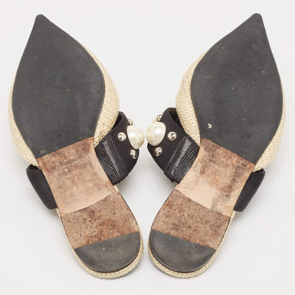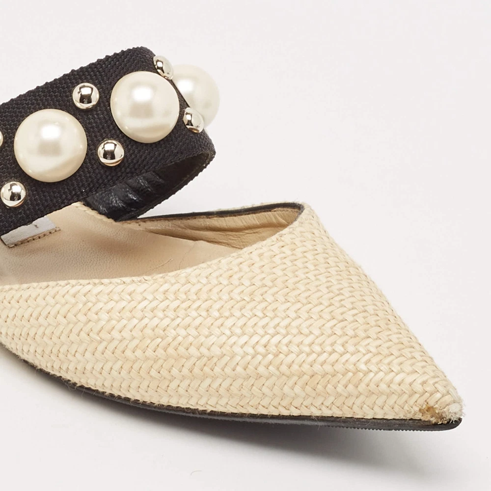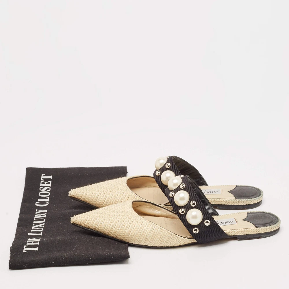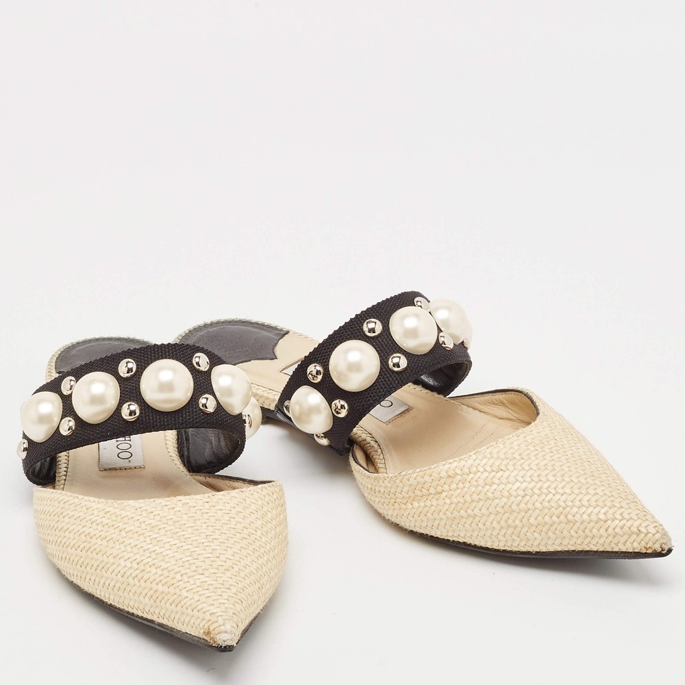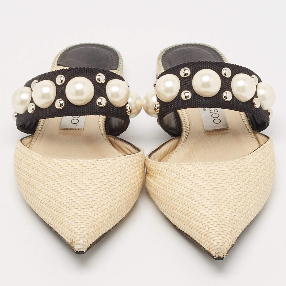 Our eBay Store About Us Contact Us Add to Favorite Sellers Jimmy Choo CreamBlack Canvas and Raffia Embellished Mules Size 37.5 A perfect blend of luxury, style, and comfort, these designer mules are made using quality materials and frame your feet in the most elegant way. They can be paired with a host of outfits from your wardrobe. Product Details Brand Jimmy Choo Color Cream Includes The Luxury Closet Packaging Outsole Length 27 cm Outsole Width 8 cm Size 37.5 Certified by The Luxury Closet This item has gone through a detailed authentication process overseen by our experts. We offer a lifetime guarantee of authenticity on all our items. How We Check The in-house team of experts at The Luxury Closet is highly trained to verify the authenticity and the condition of the luxury products. They ensure that only 100% authentic items are put on sale.The evaluation process is unique with its own mix of assessment criteria and differs according to the category. Each item is evaluated based on the following combination of hallmarks, hardware, stitching, symmetry, material, craftsmanship, stamping, codes, hologram stickers, and packaging. Our authenticators also check if the items have been modified or amended (e.g., aftermarket diamonds, replaced batteries, repaired bags, etc.) International Buyers Import duties, taxes and charges are not included in the item price. These charges are the buyers responsibility. Please check with your country’s customs office to determine what these additional cost will be prior to buying.
