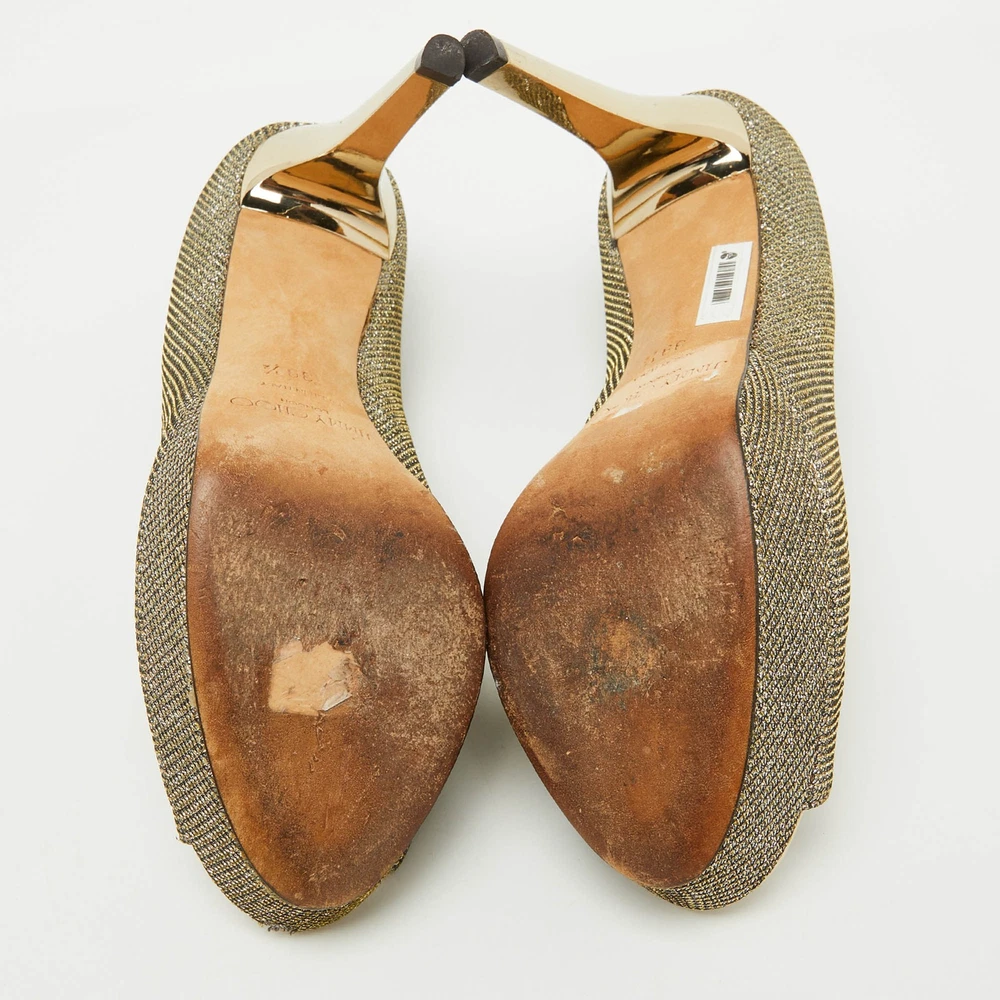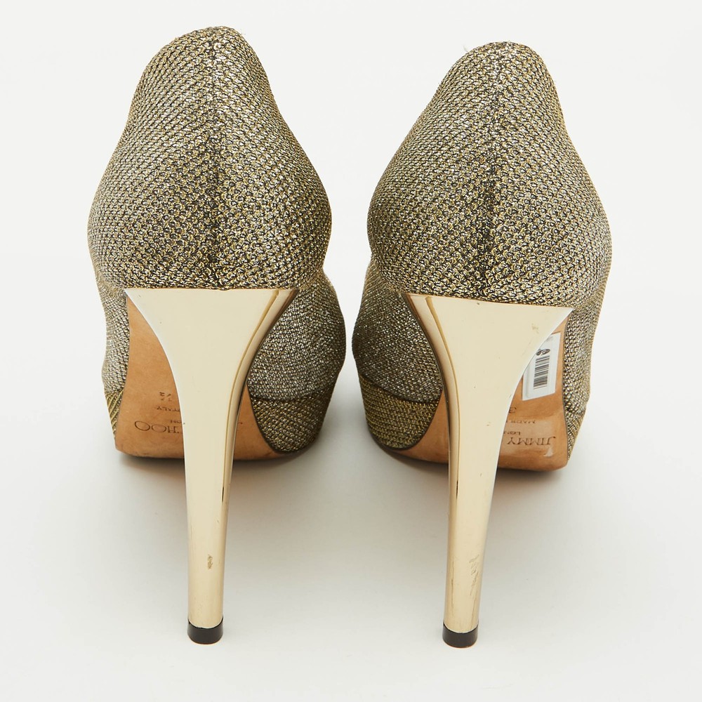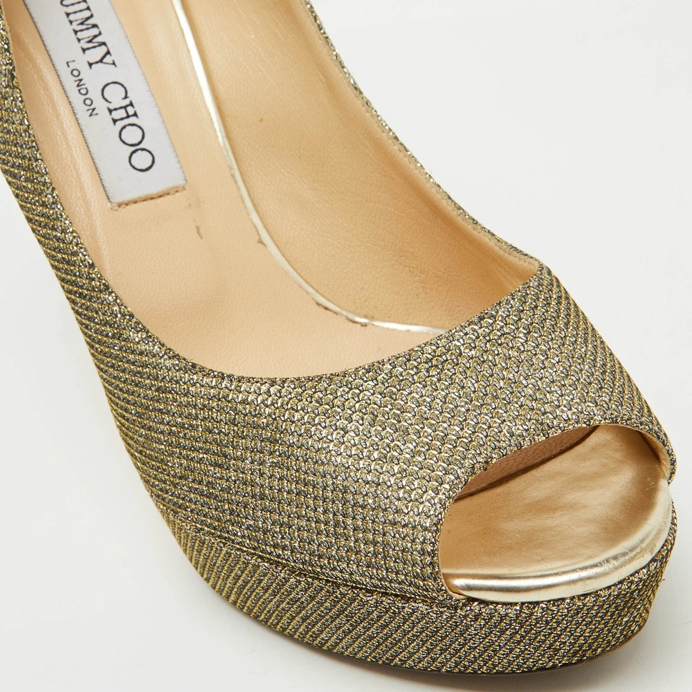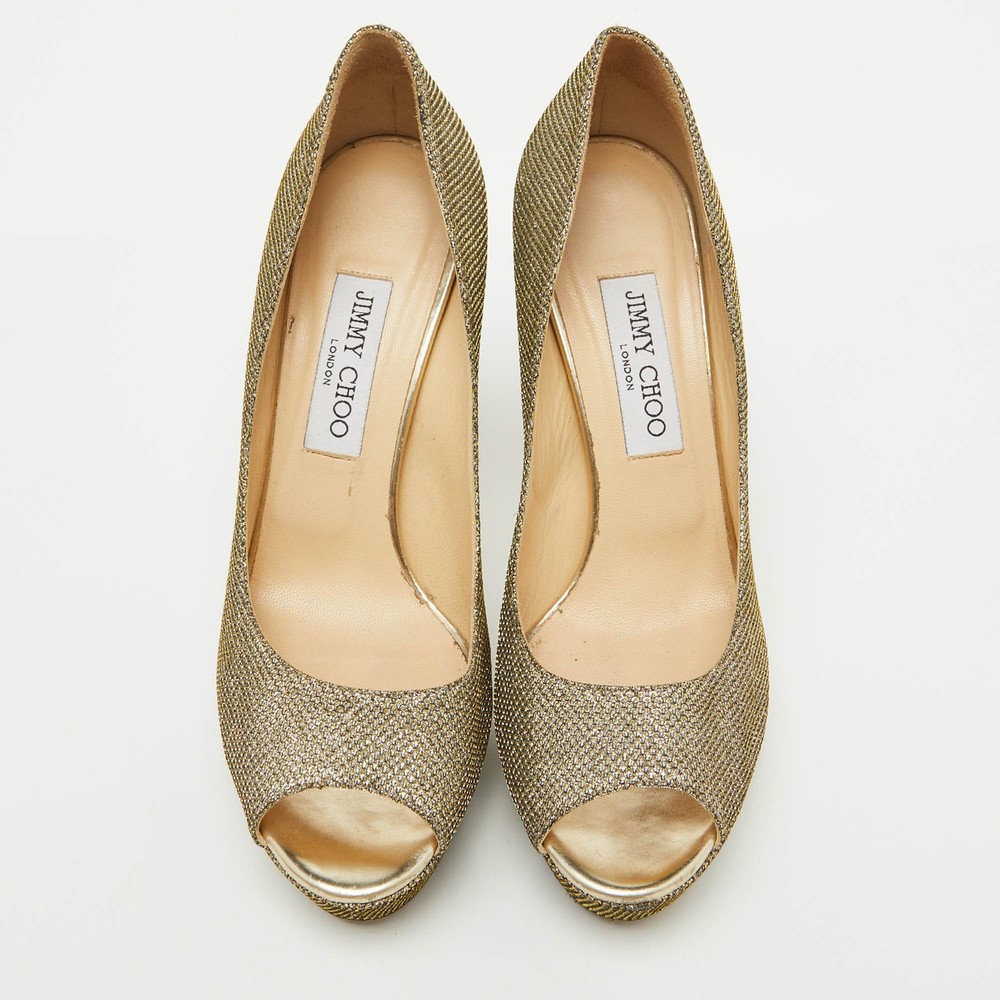 Make a chic style statement with these designer pumps. They showcase sturdy heels and durable soles, perfect for your fashionable outingsCertified by The Luxury Closet - This item has gone through a detailed authentication process overseen by our experts. We offer a lifetime guarantee of authenticity on all our items. Import duties, taxes and charges are not included in the item price. These charges are the buyers responsibility. Please check with your country’s customs office to determine what these additional cost will be prior to buying. Our eBay Store About Us Contact Us Add to Favorite Sellers Jimmy Choo Metallic Gold Lurex Fabric Peep Toe Platform Pumps Size 39.5 $188.1 Make a chic style statement with these designer pumps. They showcase sturdy heels and durable soles, perfect for your fashionable outings Product Details Brand Color Gold Dimensions Material Metallic Lurex Fabric Size 39.5 Outsole Width 6.5 cm Outsole Length 24.5 cm Heel Height 11.5 cm Includes The Luxury Closet Packaging Certified by The Luxury Closet This item has gone through a detailed authentication process overseen by our experts. We offer a lifetime guarantee of authenticity on all our items. How We Check The in-house team of experts at The Luxury Closet is highly trained to verify the authenticity and the condition of the luxury products. They ensure that only 100% authentic items are put on sale.The evaluation process is unique with its own mix of assessment criteria and differs according to the category. Each item is evaluated based on the following combination of hallmarks, hardware, stitching, symmetry, material, craftsmanship, stamping, codes, hologram stickers, and packaging. Our authenticators also check if the items have been modified or amended (e.g., aftermarket diamonds, replaced batteries, repaired bags, etc.) International Buyers Import duties, taxes and charges are not included in the item price. These charges are the buyers responsibility. Please check with your country’s customs office to determine what these additional cost will be prior to buying.