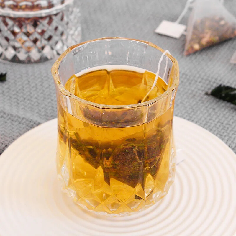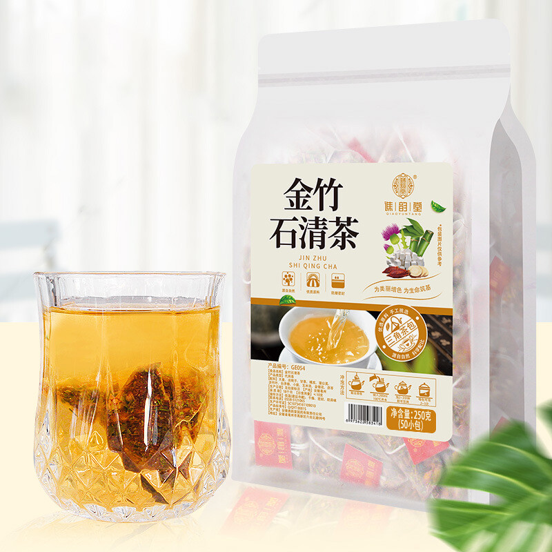 Product name: Jinzhushi Qingcha Specification: 250g/bag (50 small bags) Ingredients: barley cassia seed liquorice orange peel Ta raxacum light bamboo leaf fresh white grassRoot thistle Corn silk honeysuckle tuckahoe Shelf life: 18 months Storage: Store in a cool and dry place This product adopts a triangular tea bag design, which can prevent tea ingredients from entering the mouth when drinking. Independent small bags are more convenient. All raw materials are of good quality and scientifically proportioned