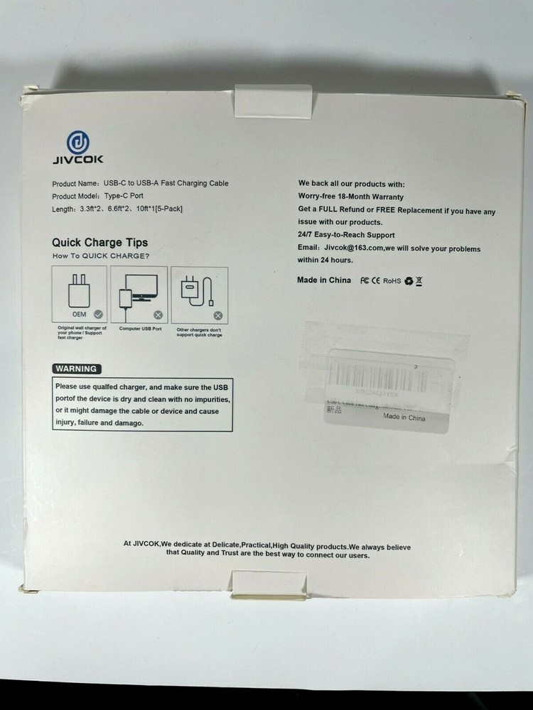 Jivcok USB-C to USB-A Charging Cable Nylon - 5 Pack 3.3ft*2, 6.6ft*2, 10ft*1 Open box, excellent condition, tested. 5 pack: 3.3ft*2, 6.6ft*2, 10ft*1. The packaging is ripped FREE Shipping! Payment must be made with PayPal and items purchased will only be shipped to the verified address on the PayPal account. If you require the item shipped to an alternate address, you must add this account to your PayPal account prior to completing checkout. No Warranties or Returns on Used items. Used Items are Sold As-Is