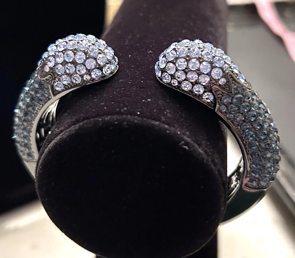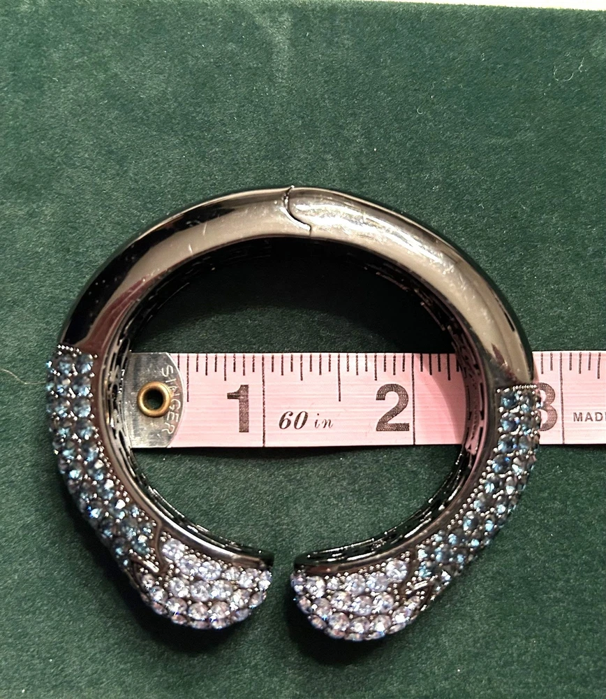 This Joan Boyce cuff bracelet is a statement piece, echoing whispers of elegance and sophistication. Adorned with sparkling blue Swarovski crystals, it mimics the night sky. The black metal adds a touch of mystery, while the hinged design offers ease of wear. A timeless accessory for those who appreciate the allure of crystalline beauty. • Hinged design for secure fit • Sparkling blue crystals • Elegant and sophisticated style • Black metal construction • Timeless and versatile Diameter: 2.5 inches