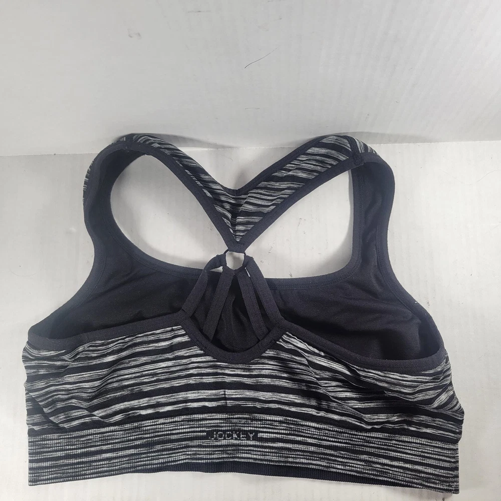 This Jockey Sports Bra in size XL is perfect for women who want to combine comfort and style. The bra features a solid black color and wide straps for added support. It also has a pullover closure for easy wear and is wireless, meaning it doesn't have any underwire. The bra is padded for added coverage and has a sports-style design, making it perfect for athletic activities. It is made by Jockey, a trusted brand in the industry, and is available in regular size. This Sports Bra is a great addition to any wardrobe and is perfect for those who want to feel comfortable and stylish while exercising.