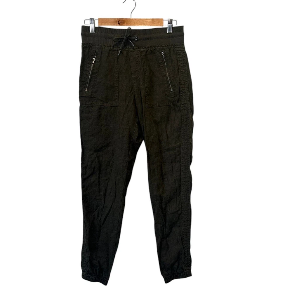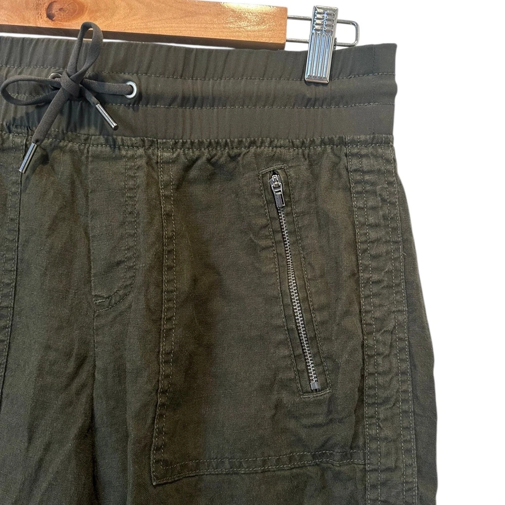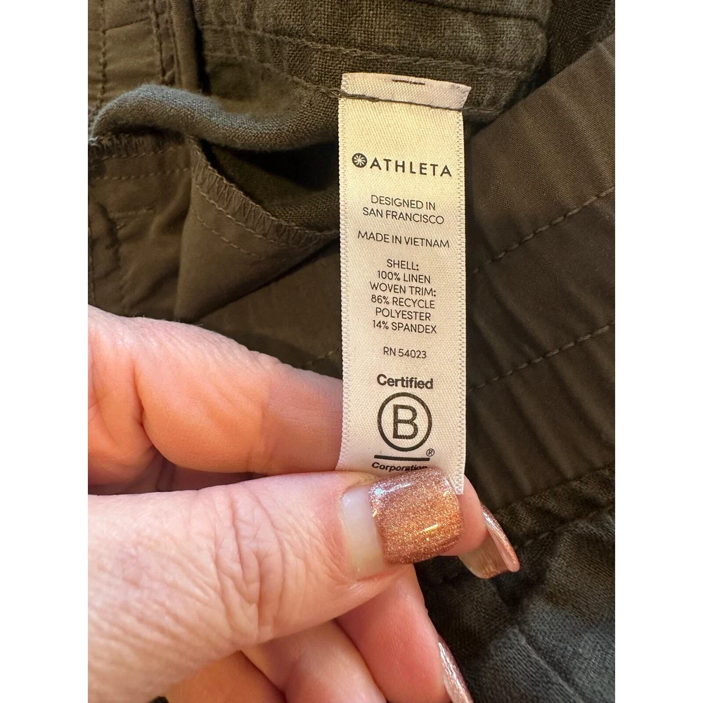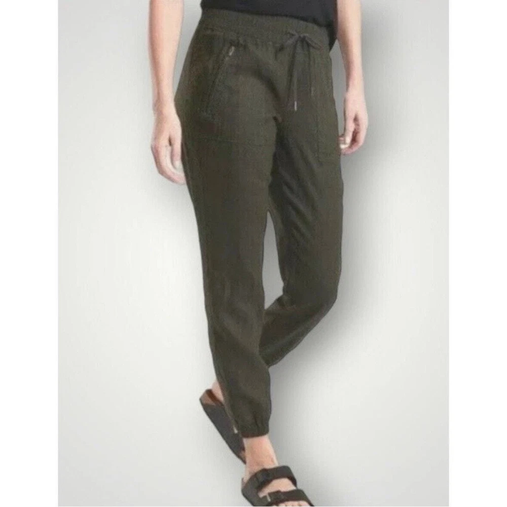 Athleta Cabo 100% Linen Coastal Grandma Minimalist Classic Joggers Olive Green Size 2 Tall Product Details FOR: Warm-weather travels, resort vacations, and to and from the beach FEEL: Our take on lightweight linen fabric is subtly textured and 100% washable FAVE: Front zip pockets secure your essentials Cinch at ankle for a custom fit Fabric sheerness is due to the lightweight nature of linen 100% Linen BREATHABLE: Airflow moves easily through the garment Machine wash inside out Imported. 100% Linen Approximate Measurements Waist 15” across Inseam 30” Rise 10.25”