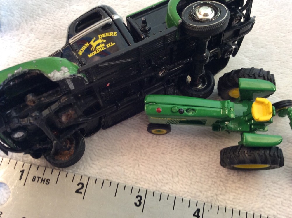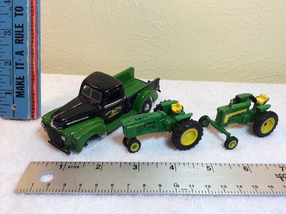 Three John Deere toys. The truck is missing a wheel and some paint. One of the tractors is missing the steering wheel.