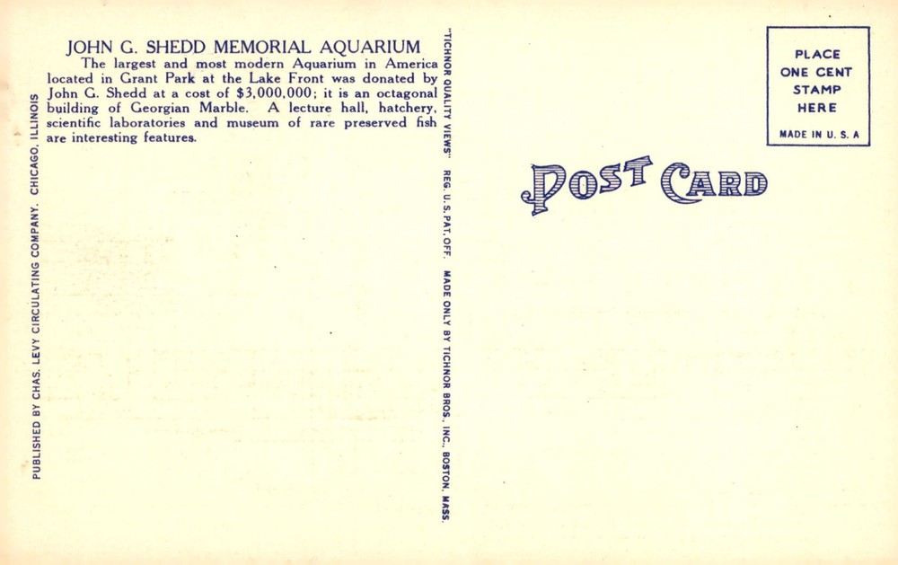 Explore the largest and most modern Aquarium in America, located in Grant Park at the Lake Front. Donated by John G. Shedd at a cost of $3,000,000, this octagonal building of Georgian Marble houses a lecture hall, hatchery, scientific laboratories, and a museum of rare preserved fish.