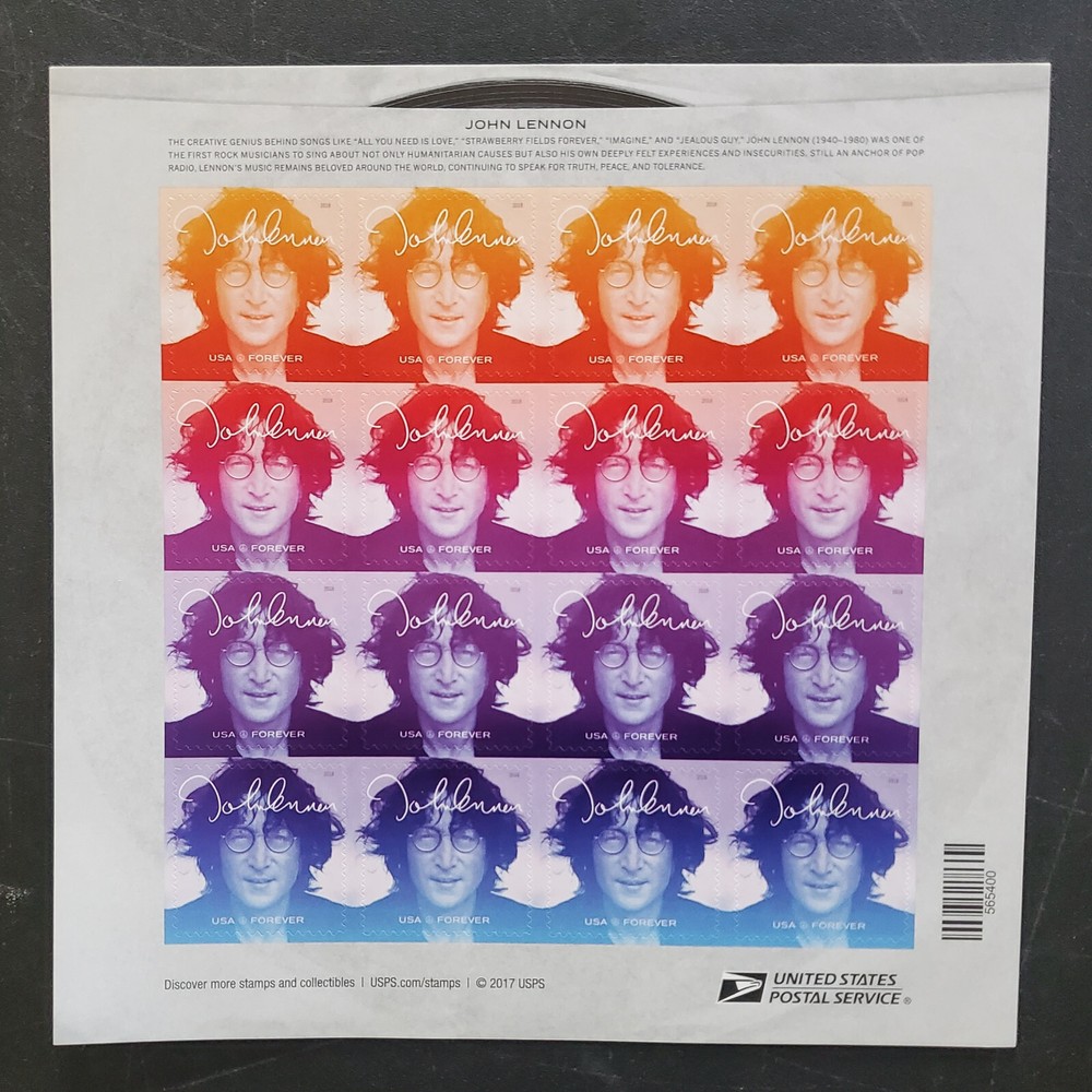 US Stamp Scott #5312-15 John Lennon Forevers 5 Sheets of 16 (80pc) *** INTERNATIONAL SHIPPING QUOTED*** Thank you for viewing... Please email any questions you may have.... Take a moment and check out our other unique auctions !!! ***** Email us about signing up for our mailing list******* Exciting new items every day Philately - The Quiet Excitement Shipping We try to Ship Within 5 Business Days of Cleared Payment Will calculate international shipping PLEASE READ International Buyer's Shipping Instructions International shipping "" First Class Registered ENVELOPE " NO EXCEPTIONS ! ** Insurance, Registered mail or Confirmation/Signature Guarantee is included in the price of shipping for the USA only ** Our goal is to please our customers, provide quality and unique items, have successful transactions and earn positive feedback with a 5 star rating. We strive for accurate descriptions, quick turnaround, detailed communication, and reasonable shipping charges on every lot. Your feedback is important to us. If you feel anything about the transaction was less than 5 star, please give us the opportunity to rectify the situation Thank you The Staff at Henry Gitner Philatelists, Inc.