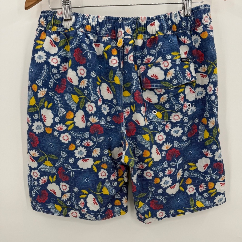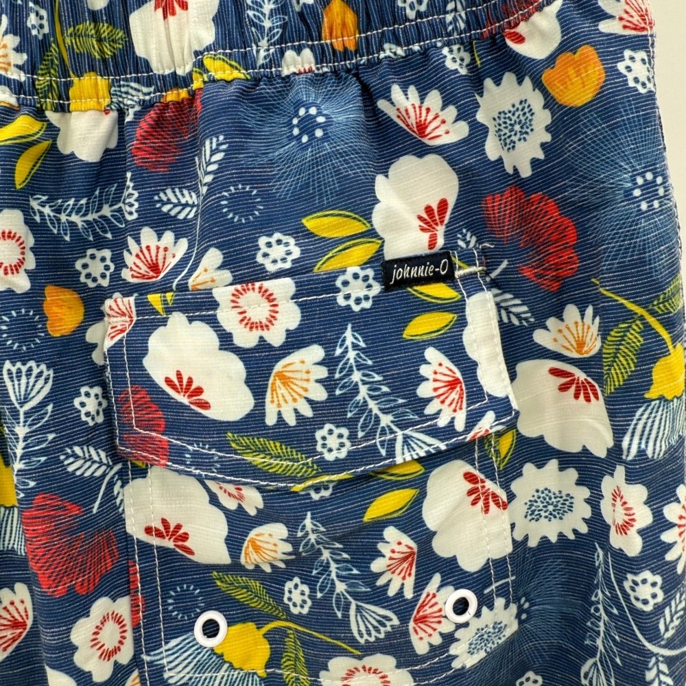 Stylish floral swim trunks by Johnnie-O, featuring a vibrant pattern of red, white, and yellow flowers against a blue background. These shorts have a comfortable elastic waistband with a drawstring for a secure fit. Functional design includes a back pocket with a button closure, as well as a front pocket, perfect for storing small items. The interior is fully lined with mesh for breathability and comfort, enhancing the overall wearing experience. These swim trunks are ideal for adding a pop of color and style to your beach or poolside look. Measurements: • Waist: 31" • Rise: 12" • Inseam: 7.5" Color: Blue Swim Bottom Style: Swim Shorts Department: Men Pattern: Floral Features: Back Pocket, Elastic Waist, Drawstring, Lined, Pockets, Quick Dry Material: Polyester, Spandex, Cotton Performance/Activity: Surfing, Recreational Keywords: Johnnie-O, swim trunks, floral shorts, mens swimwear, beach shorts, pool shorts, blue floral, size 31, elastic waist, drawstring, casual shorts, summer fashion, vacation wear
