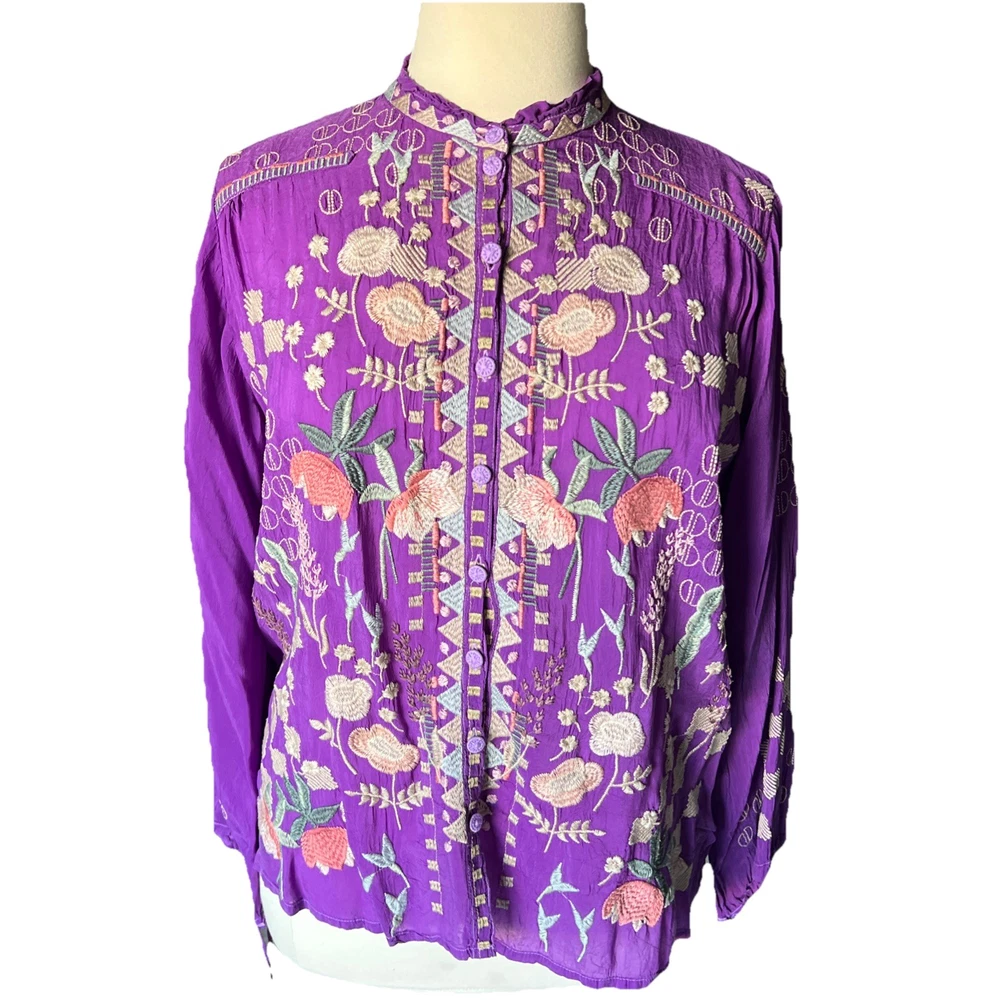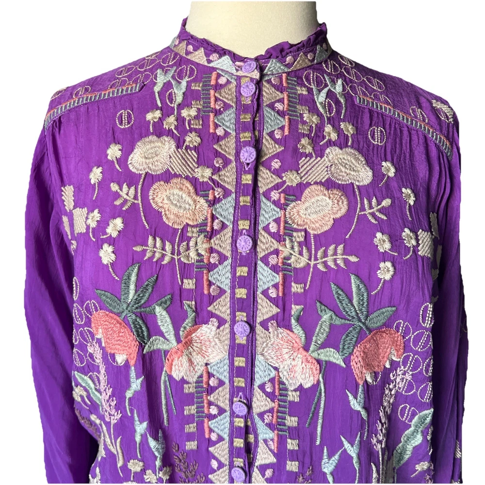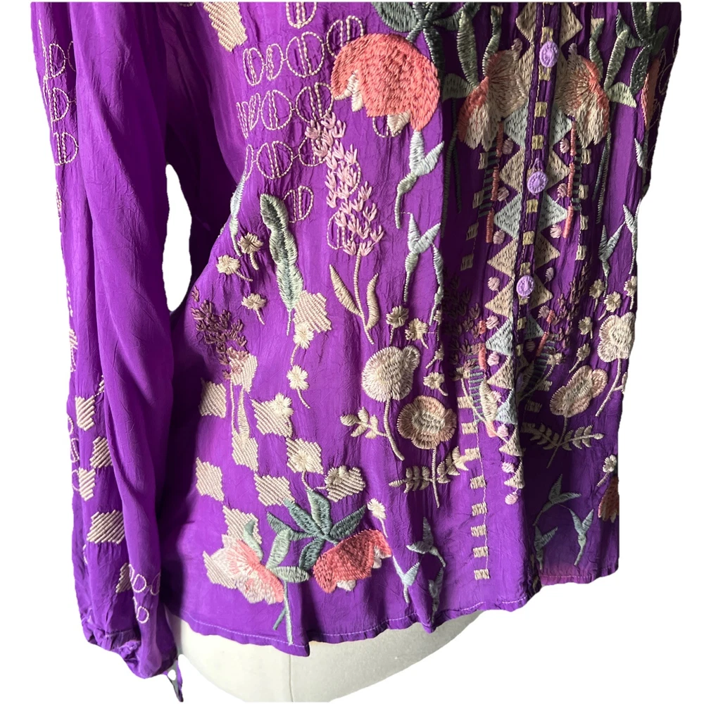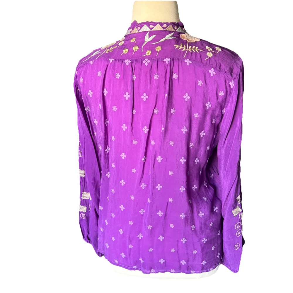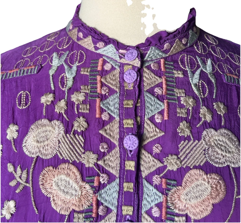 Up for sale is this beautiful embroidered button down shirt by Johnny Was. Size XL. Fabric covered buttons. Made of cupra rayon (vegan silk). Drawstring sleeves with ties. 23” long sleeve. Overall this top is 27” long. Measures 24” from underarm to underarm. In truly excellent condition with no flaws or even signs of previous use to report. The first pictures are straight from the Johnny Was website when this top was still in stock. The remainder are my own photos of the actual top you will receive. Thanks for stopping by my store—Technicolor Turnstile—where shipping is always free within the U.S.! I’ve been selling on ebay since 2002, so you can buy with confidence. And I take at least a dozen orders to the post office every single day Monday thru Saturday, so your items will get to you quickly and safely. Thanks so much for looking and feel free to message me anytime with questions!