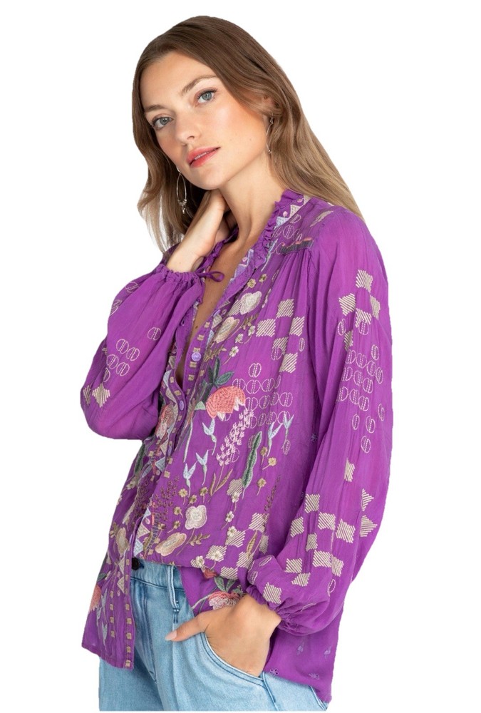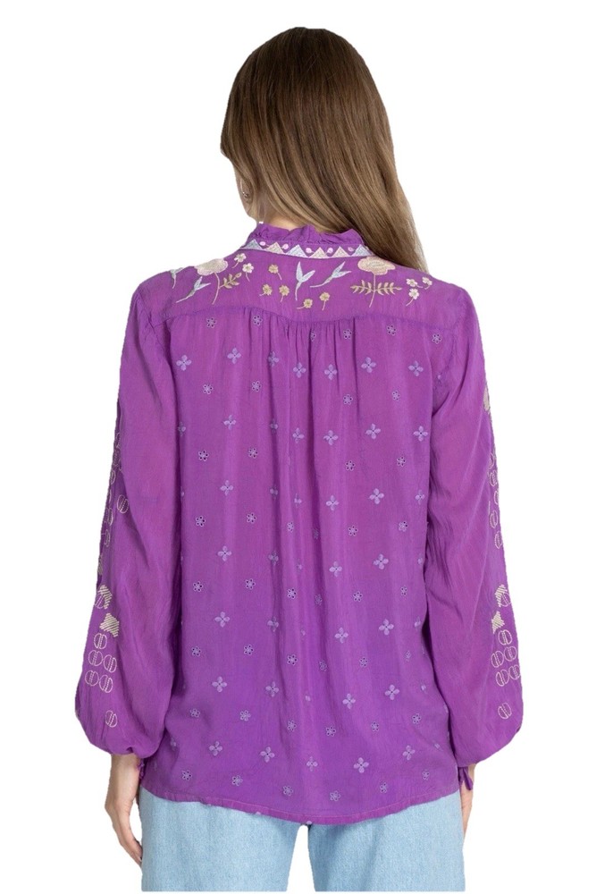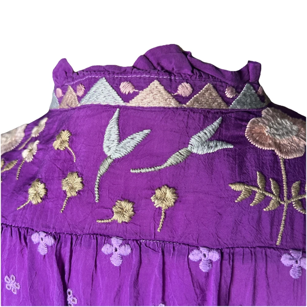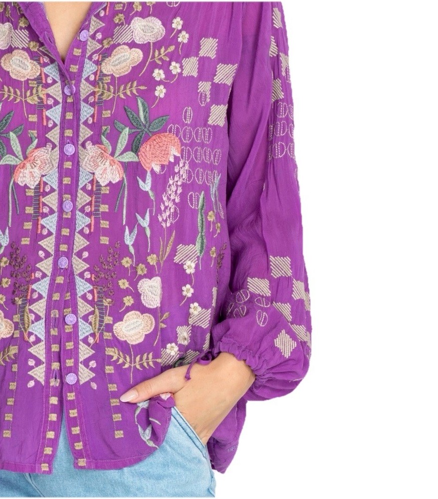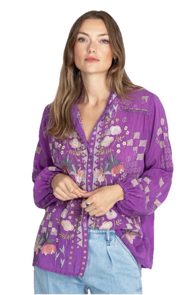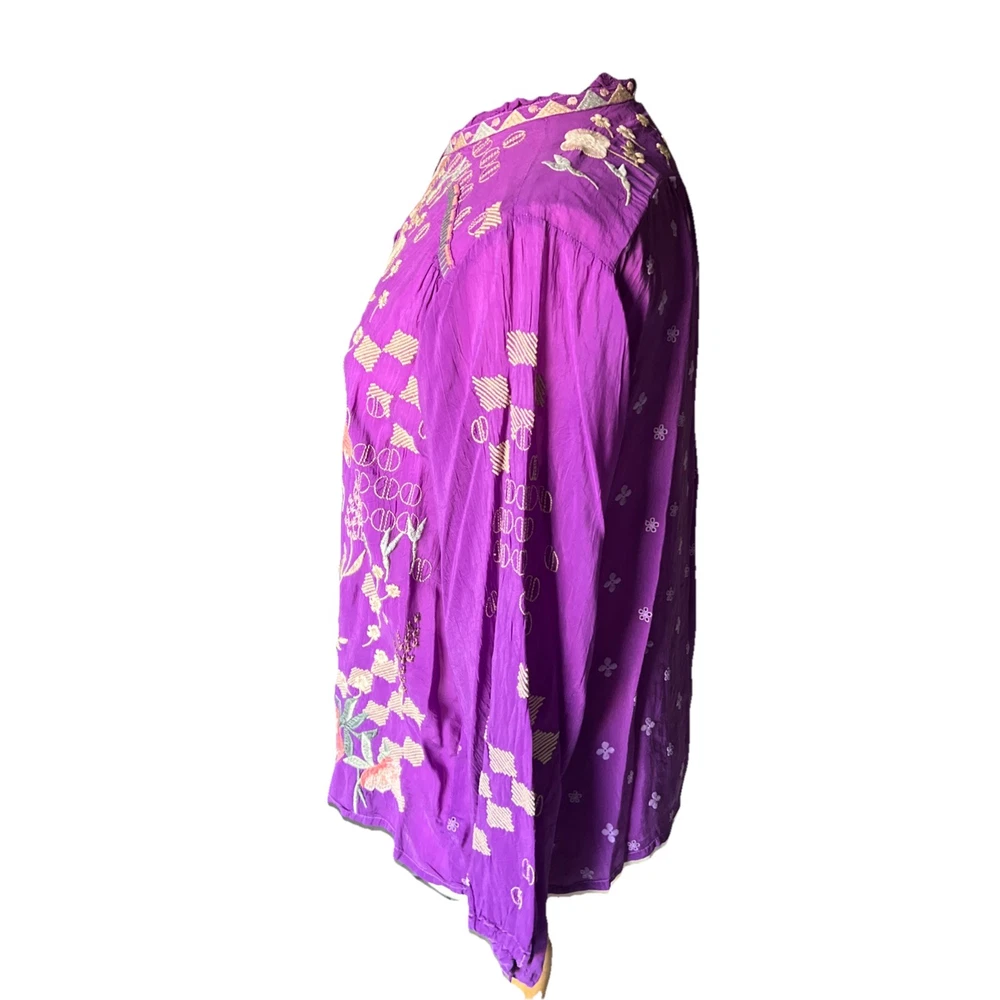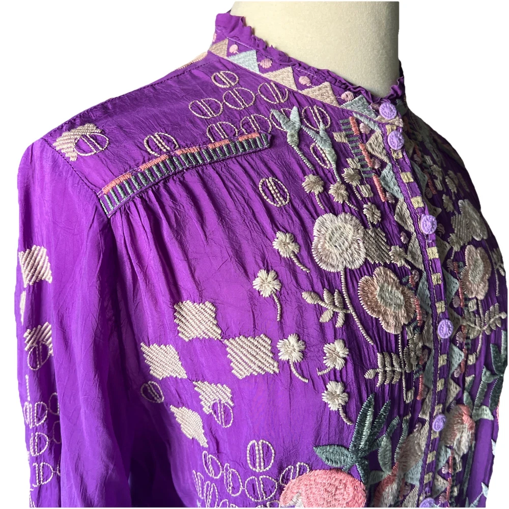 Up for sale is this beautiful embroidered button down shirt by Johnny Was. Size XL. Fabric covered buttons. Made of cupra rayon (vegan silk). Drawstring sleeves with ties. 23” long sleeve. Overall this top is 27” long. Measures 24” from underarm to underarm. In truly excellent condition with no flaws or even signs of previous use to report. The first pictures are straight from the Johnny Was website when this top was still in stock. The remainder are my own photos of the actual top you will receive. Thanks for stopping by my store—Technicolor Turnstile—where shipping is always free within the U.S.! I’ve been selling on ebay since 2002, so you can buy with confidence. And I take at least a dozen orders to the post office every single day Monday thru Saturday, so your items will get to you quickly and safely. Thanks so much for looking and feel free to message me anytime with questions!