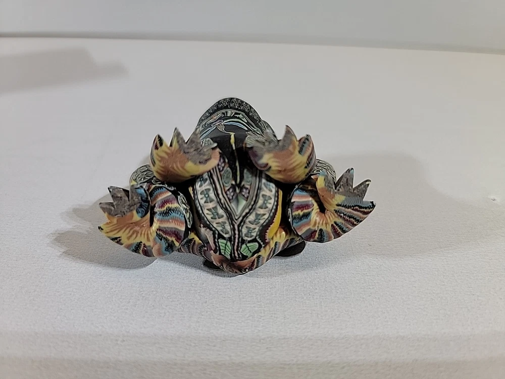 Jon Stuart Anderson small frog sculpture features many floral elements and Dragonfly's with many delicate details applied throughout the friendly creature.