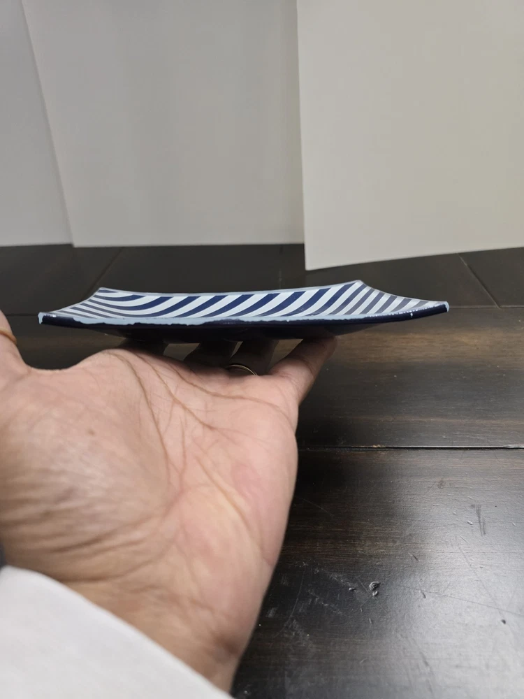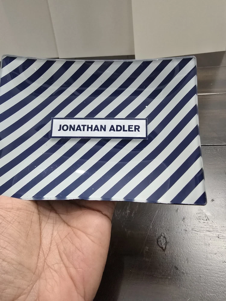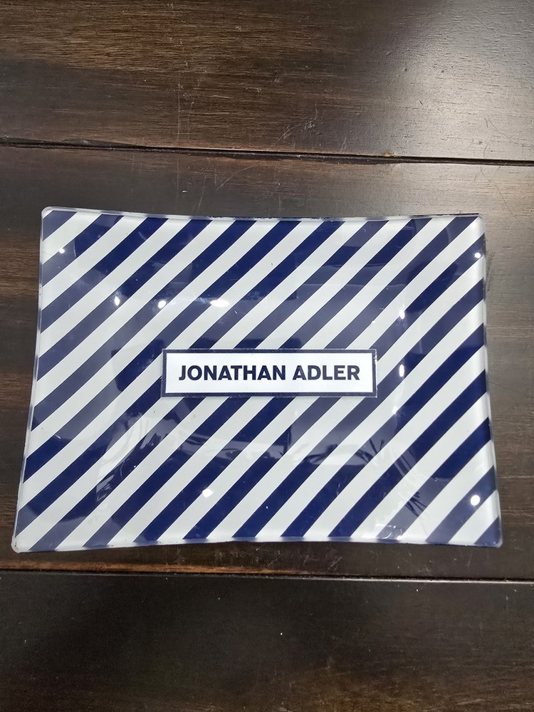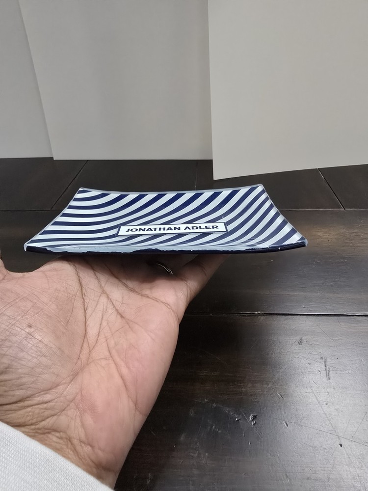 The Jonathan Adler Glass Catch-all Tray in Navy Striped is a stylish and modern soap dish for adult bathrooms. Made of glass with a polished finish, this 6x4 inch dish is perfect for keeping your soap bar secure and dry. The navy striped design adds a touch of elegance to any bathroom decor, making it both functional and aesthetically pleasing. With no assembly required, this soap dish is a convenient and practical addition to your home.