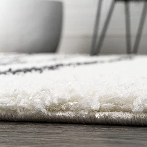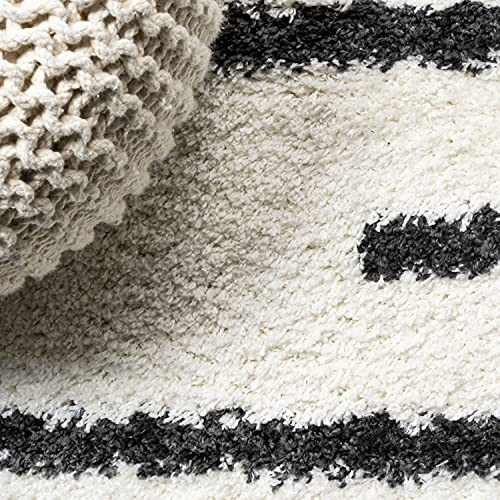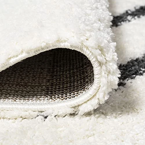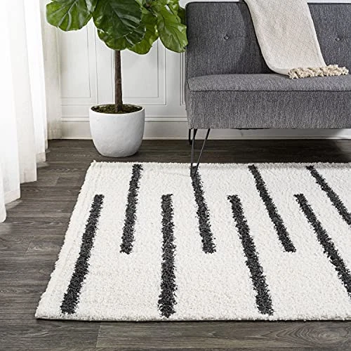 Inspired by vintage Moroccan rugs, our modern striped rug has a soft, low shag pile. The central stripe pattern is woven in black on an ivory background; our tribal-inspired design recalls traditional handwoven rugs. Add some Bohemian style to your living room, bedroom, or reading nook with this easy-care rug. PET-FRIENDLY AND DURABLE: Durable for high-traffic areas, soft and comfortable area rug perfect for families with kids; Low-pile synthetic rug fibers won’t trap dirt and debris, so they’re pet-friendly and easy to clean STAIN-RESISTANT AND NON-SHEDDING: This rug is made from synthetic fibers that are water resistant, stain resistant; It’s been machine-woven so the rug fibers will stay put; When properly cared for, this rug won’t shed fluff into your home EASY TO CARE FOR: Vacuum regularly; Always raise or turn off the beater bars on your vacuum; Spot clean stains immediately with a mild detergent or carpet cleaning product, then rinse thoroughly and blot dry; Professional rug cleaning is recommended Power loomed with a 1.37" pile that's fluffy and durable The gray and ivory color scheme is a modern take on neutral, vintage Moroccan rugs