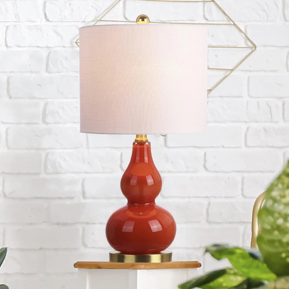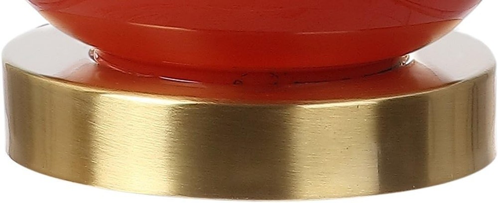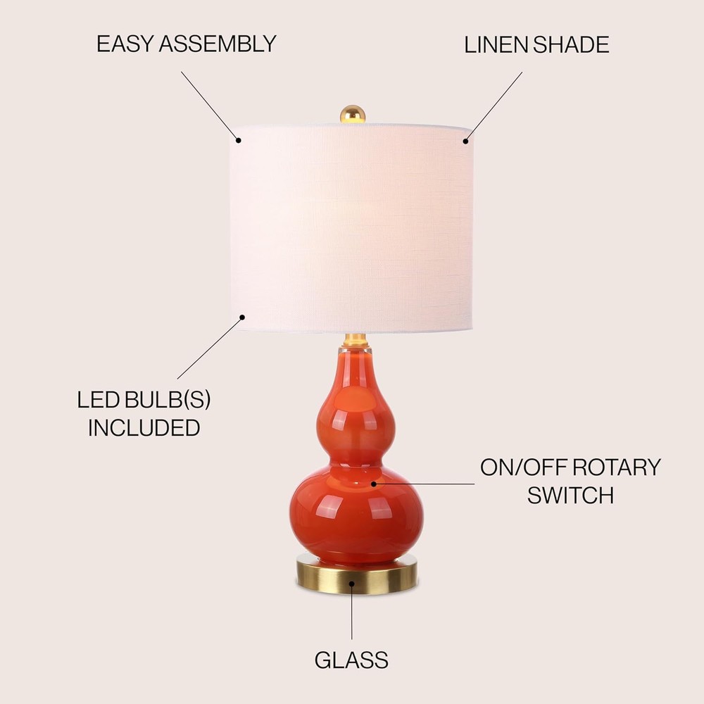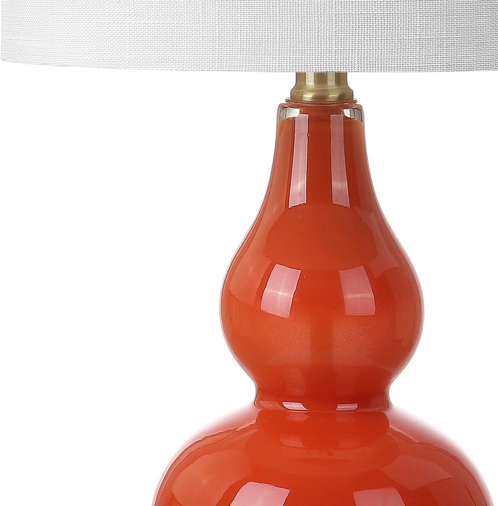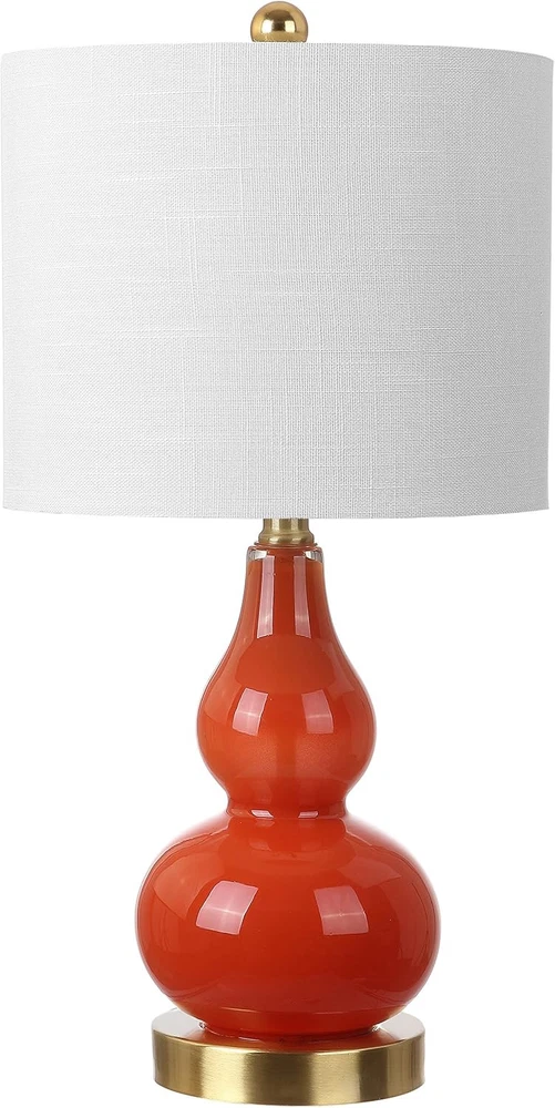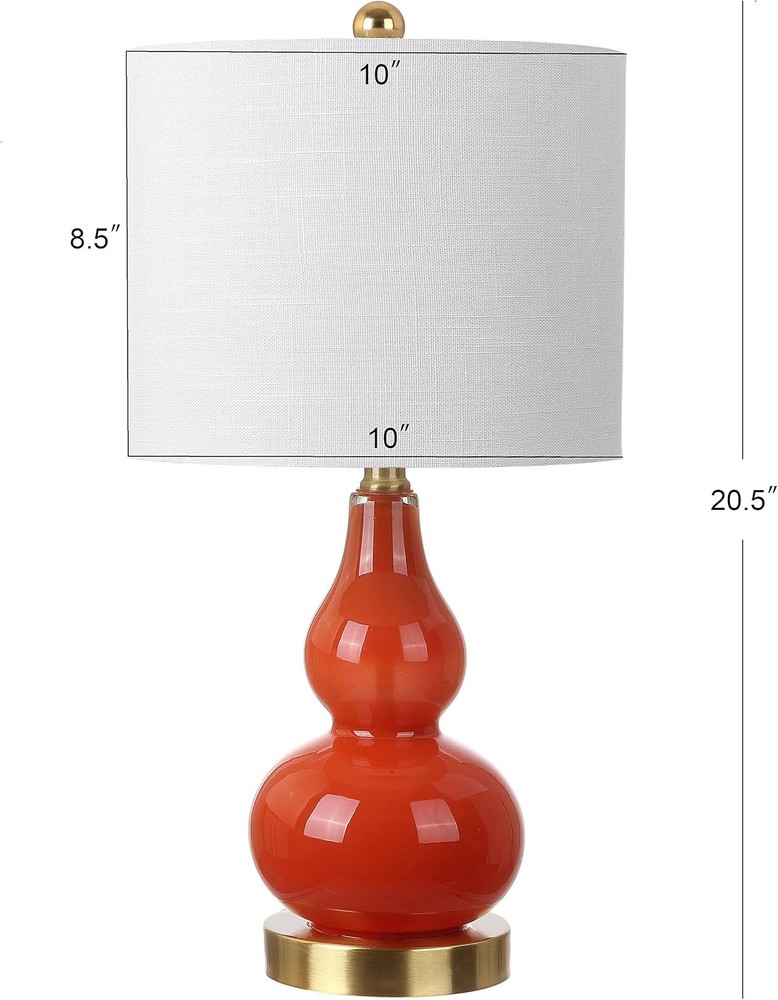 JONATHAN Y JYL1028G Anya 20.5" Mini Glass LED Table Single, Sunset Orange Product Details Finish Type: Brushed Base Material: Brass Bulb Base: E26 Product Dimensions: 10"D x 10"W x 20.5"H Item Weight: 2.64 Pounds Lamp Type: Table Lamp Shade Color: White Shade Material: Faux Porcelain Resin Switch Type: alexa Style: Glam Brand: JONATHAN Y Color: Sunset Orange Special Feature: Eco-friendly 4W LED bulb included Light Source Type: LED Material: Glass Room Type: Office Recommended Uses For Product: Decoration Power Source: AC Shape: Drum Number of Light Sources: 1 Connectivity Technology: Normal bulb Included Components: 1 mini lamp, 1 bulb Age Range (Description): Adult Is Waterproof: False Bulb Shape Size: G40 Mounting Type: Tabletop Wattage: 9 watts Number of Items: 1 Lighting Method: Downlight Control Method: Voice Indoor/Outdoor Usage: Indoor Specific Uses For Product: Indoor use only Water Resistance Level: Not Water Resistant Installation Type: Tabletop Number of Pieces: 1 Connectivity Protocol: Wi-Fi Efficiency: High energy efficiency Voltage: 110 Volts Is Cordless?: No Size: Single Manufacturer: JONATHAN Y Shade Height: 10.25 Inches Part Number: JYL1028G Item Weight: 2.64 pounds Country of Origin: China Item model number: JYL1028G Is Discontinued By Manufacturer: No Finish: Brushed Pattern: Solid Item Package Quantity: 1 Special Features: Eco-friendly 4W LED bulb included Batteries Included?: No Batteries Required?: No Finish Type: Brushed Base Material: Brass Bulb Base: E26 Product Dimensions: 10"D x 10"W x 20.5"H Item Weight: 2.64 Pounds QUALITY CONSTRUCTION: JONATHAN Y table lamps designed to illuminate your home, stylish addition to any room; included LED bulbs and our lamps fit standard light bulbs too! ETL Listed and meets 120-volt UL standards for safety and quality ENERGY-SAVING LED BULBS INCLUDED: Compatible with Alexa smart outlets (sold separately), our sturdy LED bulbs will still last multiple years; high-quality LED bulbs are an energy-saving upgrade over standard incandescent bulbs Orange glass table lamp with brass-plated base and hardware. Classic white drum shade in a hardback cotton material The smaller scale of this classic double-gourd table lamp makes it the perfect colorful and functional accent for a console table or nightstand. The hand-blown glass body stuns in a gorgeous shade of sunset orange, finished with a brushed brass base pedestal and matching accents. Up top is a white linen fabric shade and gold sphere finial. A classic glass lamp with a modern shape, this piece will add both light and style to a variety of rooms. The length of the shade is 8.5 inches.