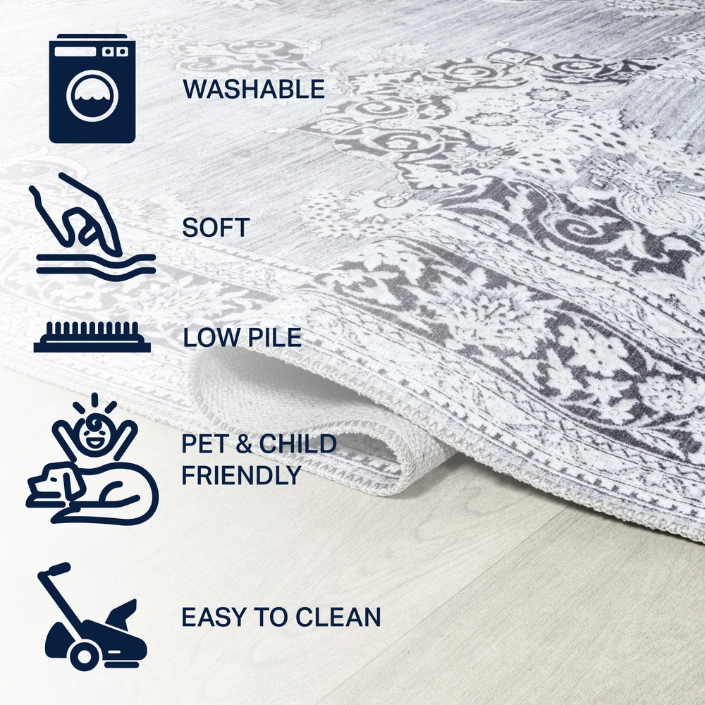 I absolutely love this rug! The distressed medallion design adds a cozy boho vibe to my living room, and the chenille feels soft underfoot. It stays perfectly in place thanks to the non-slip backing, and I was thrilled to find out it's machine washable—so convenient! The thickness is just right, giving comfort without being bulky. Perfect for high-traffic areas since it holds up well. A stylish and practical choice!