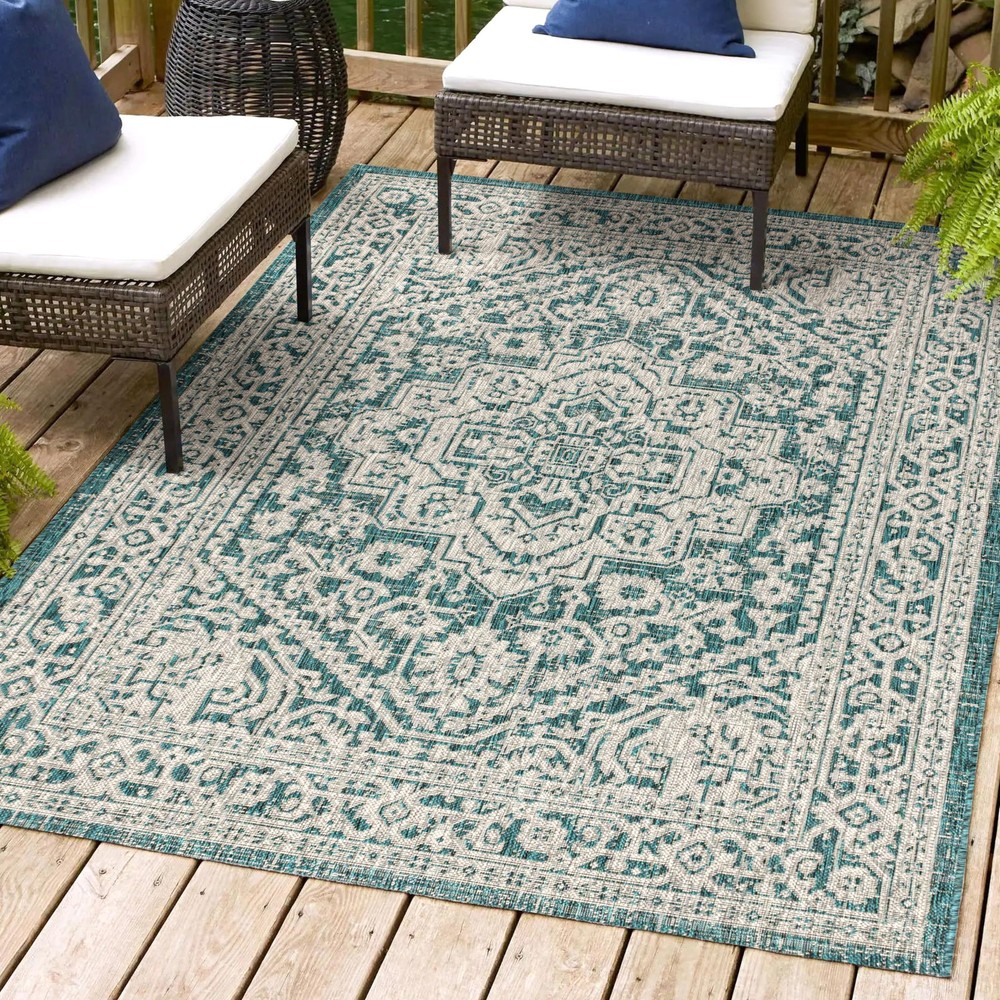 This ornate medallion rug's lively Pattern adds exotic style to an outdoor porch or patio. Varied tones of teal and dark Blue mingled with a gray pattern give this rug a hand-woven, vintage vibe. The flatweave design is great for high-traffic spaces indoors too. INDOOR/OUTDOOR DURABILITY: Give your patio, deck or porch an instant makeover with an indoor/outdoor rug; Low-pile synthetic rug fibers are durable for high-traffic spaces like the kitchen, mud room or entry; Perfect for families with kids STAIN-RESISTANT AND PET-FRIENDLY: This rug is made from synthetic fibers that resist UV fading; The pet-friendly low-pile construction won’t accumulate dirt, and spills clean up easily; It’s been machine-woven so the rug fibers will stay put EASY TO CARE FOR: To wash an outdoor rug, spray the surface with a 5-1 mixture of mild dish soap and water; Then rise thoroughly with a garden hose and hang over a railing to dry thoroughly Flat-weave construction of 100% polypropylene Deep teal blue and gray with a handwoven mingled texture