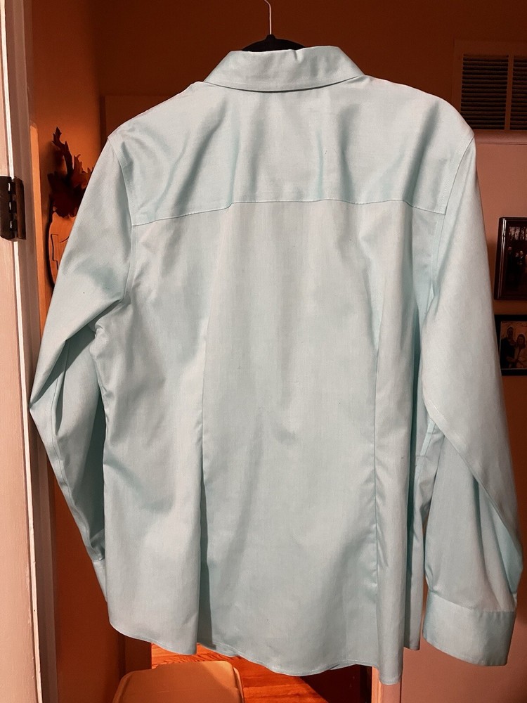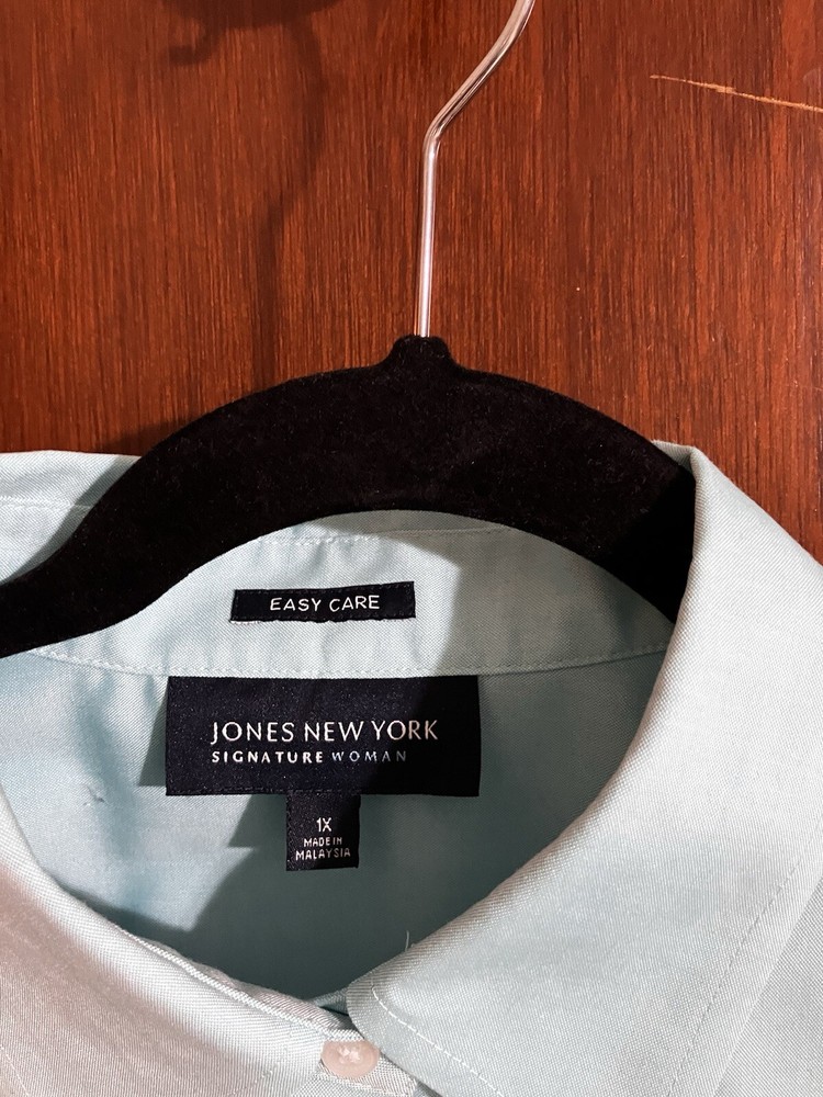 Jones of New York, "Signature woman", 1x, dress-shirt, easy care, 100% cotton, light aqua blue, long sleeve w/cuffs, bust 46", waist 44", hips 50", nice casual/business, machine washable