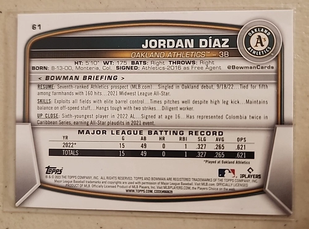 Up for sale is a highly sought-after 2023 Bowman #61 Jordan Diaz sports trading card. This card features the rookie player for the Oakland Athletics, and is licensed by Topps for authenticity. This trading card is a perfect addition to any baseball fan's collection, especially those who collect Major League (MLB) cards. The card features the character of Jordan Diaz, and has not been autographed. Don't miss your chance to own this original Bowman card, perfect for any collector or fan of the sport. Single Card. Not sold in original packaging. Condition is not professionally graded, sold as-is. Stored/shipped in protective sleeve.