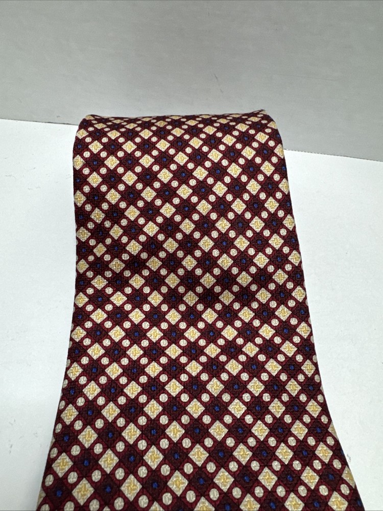 Crafted for the discerning gentleman, this Jos. A. Bank Signature Collection tie is a sartorial staple for any formal occasion. The luxurious silk fabric ensures a smooth, refined finish to your ensemble, while the classic lengths of 57 to 60 inches provide a perfect fit for most. The tie features a striking geometric pattern in red, gold, and blue hues, offering a contemporary twist on traditional business attire. Ideal for weddings, business meetings, or any upscale event, this designer tie exemplifies elegance. The exquisite design and high-quality material reflect the esteemed reputation of Jos. A. Bank, making it an essential addition to any well-dressed man's accessory collection. This item is new without tags, ensuring that you receive a pristine piece straight from the manufacturer. 57”