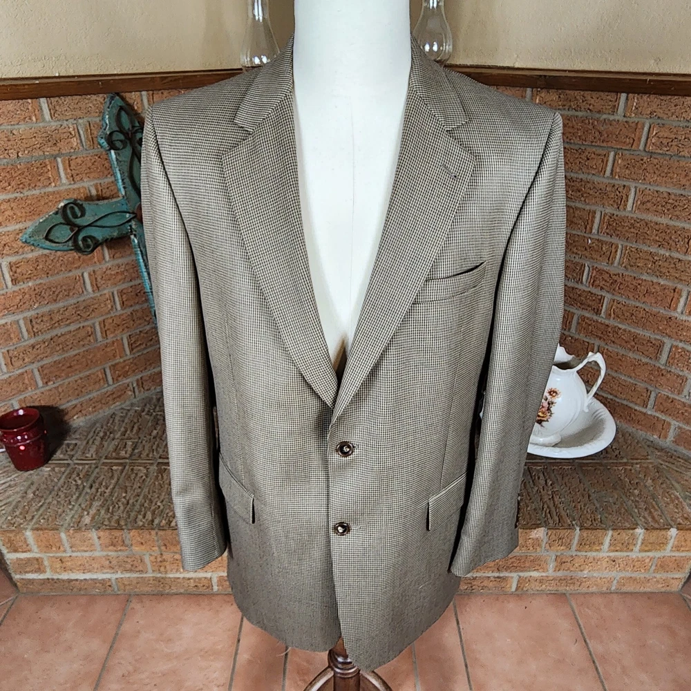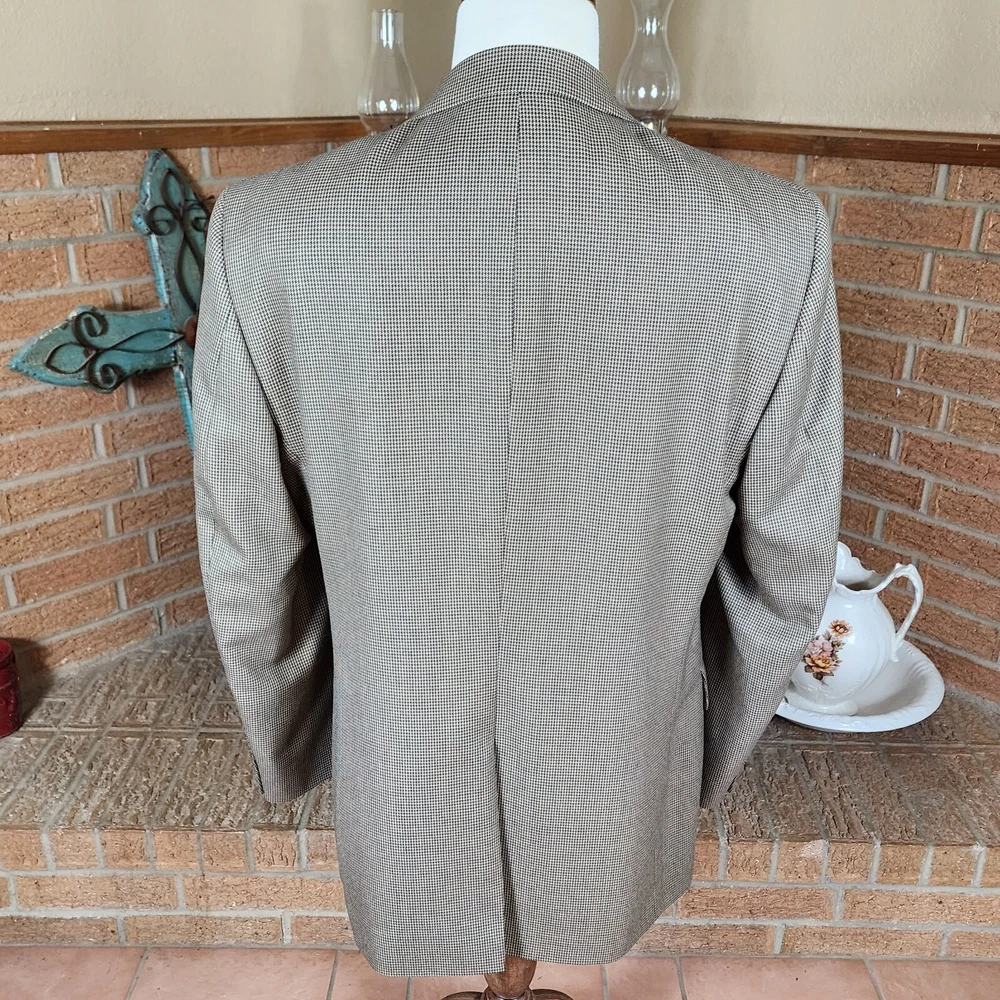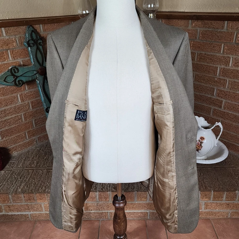 Jos. A. Bank Tan Houndstooth 100% Wool Gordon Blazer Size 43LG Brand : Jos. A. Bank Tag Size : 43LG Style : Gordon Blazer Houndstooth Signature Collection Material : 100% wool Condition details : No rips, stains, or holes Color : Tan and Black Launder: Dry clean Country of Manufacture: Mexico MEASUREMENTS are APPROXIMATE TAKEN IN INCHES with GARMENT LYING FLAT Please see photo