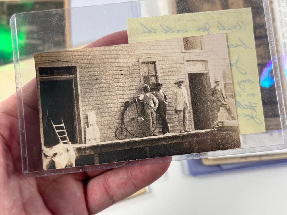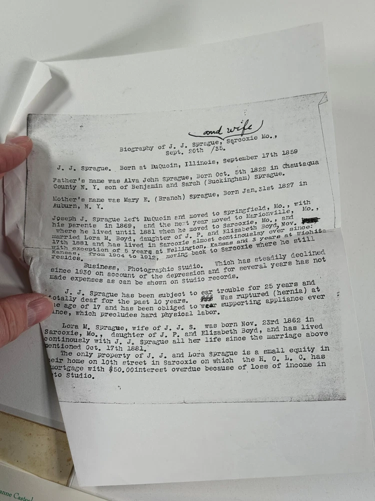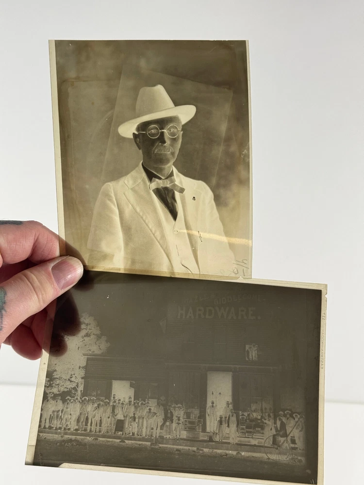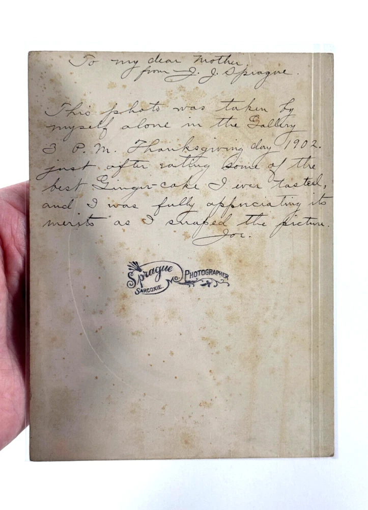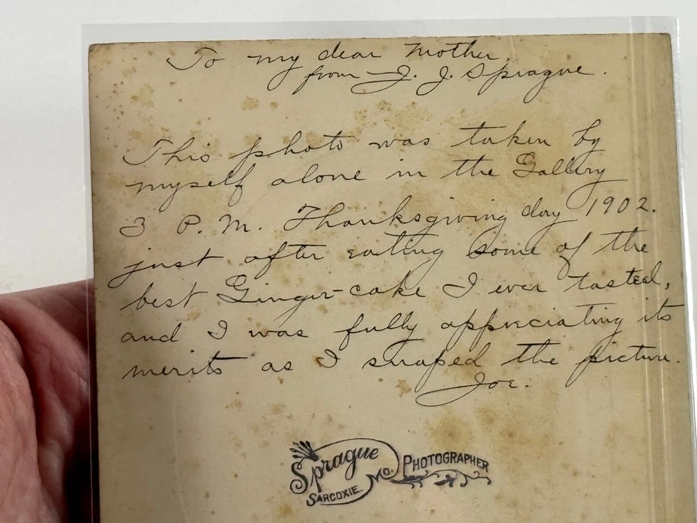 Terrific group of photos of Sarcoxie MO photog Joseph Sprague! This lot includes everything you see! Including four negatives and prints of JJ and an exterior of a hardware building, a cabinet card photo showing JJ his wife and their two children, a RARE cabinet photo showing the waiting room of his studio in Wellington Kansas, two photos showing JJ and his beloved Columbia Bicycle (which is stated to have been the first in SW Missouri), a self portrait of JJ, a letter and some family history! See photos! Ask questions! I'm sorry we dont break our lots! STORE POLICIES Please look closely at the item photos they are the best indication of condition. Please ask questions BEFORE you purchase an item. All of our items are sold AS-IS. No returns please. All offers considered, first reasonable offer accepted! We reserve the right to adjust the mode of shipping. WE NEVER BREAK OUR LOTS. Thanks! We ship all items within 3 business days . Larger items may take longer. We have been buying and selling in Southwestern Kansas for almost 20 years! Thank you for your purchases and support of our small business!