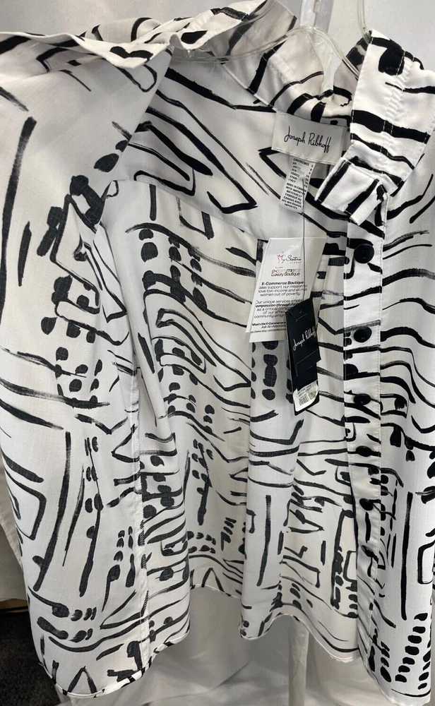 Women’s Joseph Ribkoff Blouse Style 221221 Size 6 Brand: Joseph Ribkoff Overall Condition: New With Tags. See pictures for details. Material: Polyester Shipped with USPS Priority or Flat Rate, or if possible First Class Mail. White with black brush stroke print: A versatile blouse with a stand-up collar. Abstract print: A relaxed fit blouse with a collar, 3/4 length sleeves, and subtle ruffle cuffs. Vanilla/black: A chic blouse with an attention-grabbing print. The Joseph Ribkoff brand is a Canadian fashion company that was founded in 1957 by Joseph Ribkoff. The brand is known for its style, essence, and luxury. Details for Shopper Shoulder: 16 inches Sleeve: 21 inches Bust: 20 inches Waist: 24 inches Length: 25 inches in the front, 31 inches in the back. Payment Policies We accept payment through PayPal, credit card, and debit card. Please note that the item may be relisted if payment is not received within the 10 day period. Shipping Policies Delivery estimates will be displayed at checkout. In-store pickup is also available if you would like to visit us in store. We ship to Continental United States only. Terms of Sale Each item we sell is unique. There are no exchanges for the same item available. All items are carefully inspected by My Sister’s Closet of Monroe County’s quality control team prior to shipping. Please carefully review item details. If you have questions, please message us regarding the item before purchasing. Note: Due to the different monitor and light effects, the actual color of the item shown might be slightly different from the color in pictures. Return Policy We strive to describe and measure our items accurately. If your order is not what you expected, we accept returns under the following conditions: The item was not as described as listed The wrong item was shipped. The item does not fit. If the wrong item was shipped, we will attempt to replace it with the item originally ordered. Please note - items not returned in the exact same condition, with tags attached, may be subject to a partial refund to account for loss of the item’s value. Please refer to eBay Return policy for more details. You are covered by the eBay Money Back Guarantee if you receive an item that is not described as listed. Return Requirements: The buyer must return the item within 30 days of receipt. Buyer is responsible for return shipping charges. The item(s) must be returned in the original condition, unworn, with tags attached. Thank you for shopping with us! A little bit more about us… My Sister’s Closet is a nonprofit serving women in poverty since 1998. Our mission is to help women move closer to economic self-sufficiency by providing essential career development tools. This includes job training, mentoring, advocacy services, and professional attire for job interviews to help them find employment. We have helped over 2800 women thus far. Most clients we serve have been dealing with homelessness, domestic violence, illness, divorce, job loss, economic recovery and/or lack basic education. Visit Our eBay Store