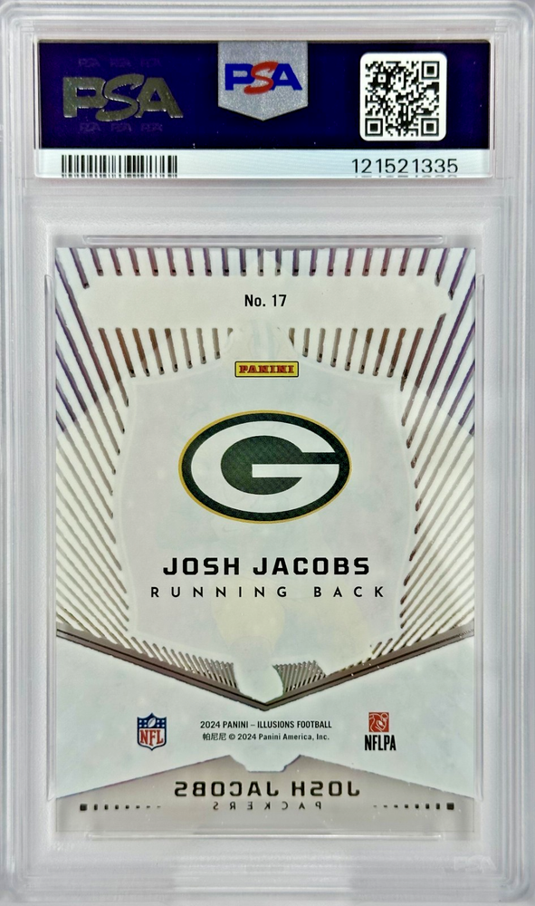 The product is a 2024 Panini Illusions trading card featuring Josh Jacobs of the Green Bay Packers. This card is part of the Abracadabra insert set and is a base parallel/variety. It is made of card stock with a thickness of 20 Pt. The card is not autographed and is an original print manufactured by Panini in the United States. The card is in English and is a standard size, suitable for sports trading card collectors and fans of the National Football League (NFL). Please check out our other listings for other great items and save on combined shipping. Thank you!