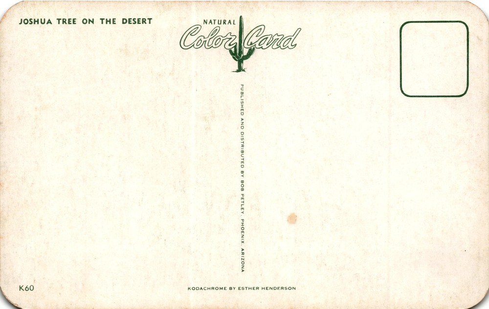 The postcard features a photograph of Joshua Tree in the desert, captured in color by Esther Henderson using Kodachrome film. The Joshua Tree is a unique and iconic plant species native to the southwestern United States, particularly the Mojave Desert. It is known for its twisted and spiky appearance, with clusters of green leaves at the top.