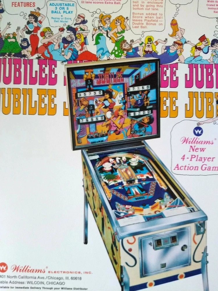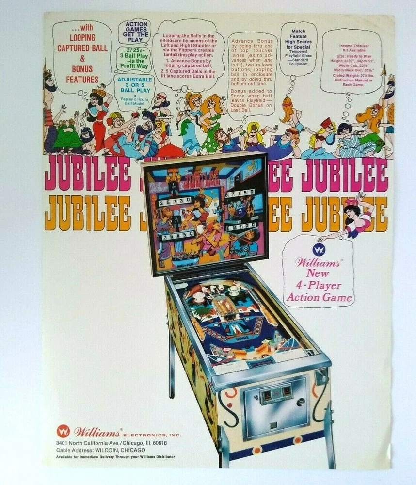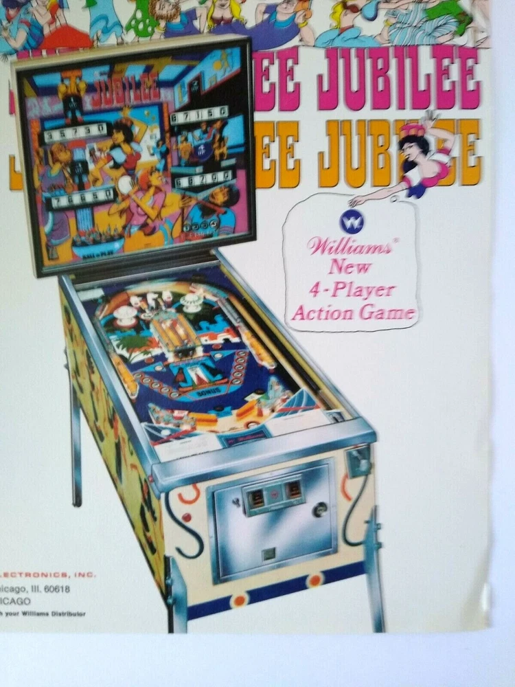 Jubilee Pinball FLYER Original Williams 1973 Game Art Print Sheet Retro Mod Original paper promo sales flyer. Single page one sided artwork sheet. Has wrinkles and creases to corners and edges. Flyers are paper promotional advertising art print sheets made for coin operated amusement arcade games. Also called a circular, brochure, pamphlet, or flier. Size is 8.5" X 11". Perfect for framing. Sheet protector included with each flyer sold. More pinball, jukebox, slot machine, and vintage arcade game items for sale in our store. SHIPPING Bundle and save by using cart and making single payment. International buyers are responsible for any import fees/taxes. ABOUT US Seller of vintage retro collectibles, pop culture, paper ephemera, new old stock advertising, artwork, original pinball flyers, vinyl records, video arcade flyers, pinball machine parts, game manuals, pinball promo plastics, Mad magazines, antique Halloween and holiday postcards, Christmas items, super hero memorabilia, horror themed art, fun gifts.