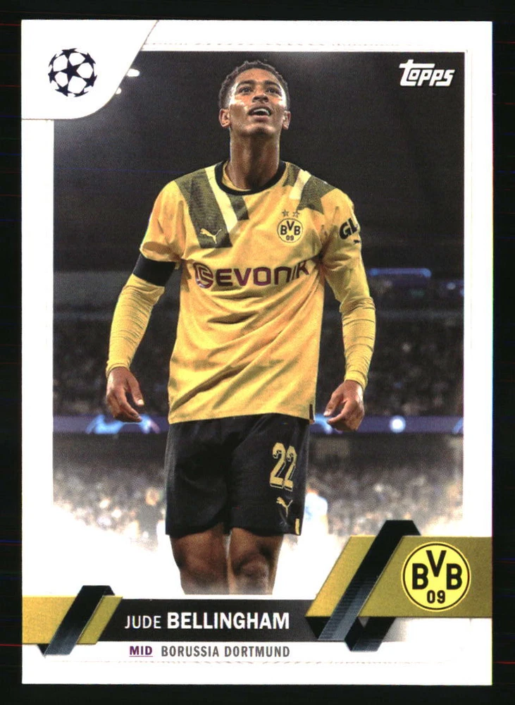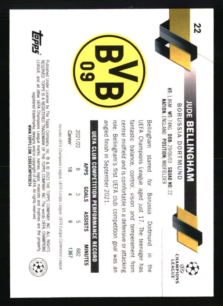 Set: 2022-23 Topps UEFA Club Competitions Carnaval Edition Manufacturer: Topps Autographed: No Team: Borussia Dortmund Year Manufactured: 2022 Player|Athlete: Jude Bellingham Type: Sports Trading Card Card Number: 22 Season: 2022 Graded: No Sport: SOCCER