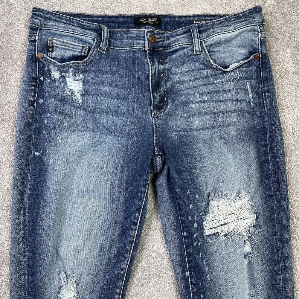 Type: Jeans Size: 32 Pattern: Solid Closure: Zip Rise: Mid (8.5-10.5 in) Fit: Relaxed Fabric Type: Denim Waist Size: 32 in Pocket Type: 5-Pocket Design Vintage: No Features: Distressed, Stretch, Pockets Model: Judy Blue Boyfriend Color: Blue Inseam: 29 in Brand: Judy Blue Size Type: Regular Garment Care: Machine Washable Fabric Wash: Medium Style: Boyfriend Department: Women Accents: Logo Season: Winter, Summer, Spring, Fall Handmade: No Theme: City, Bohemian, Preppy Personalize: No Country/Region of Manufacture: Vietnam Material: Cotton, Spandex, Polyester
