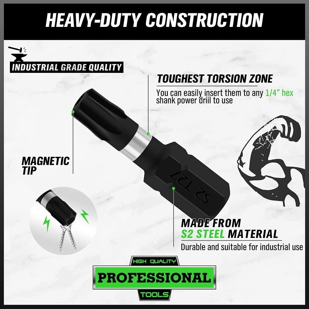 Juego De Puntas Torx De Seguridad Magnéticas Para Taladro Impacto T4-T40 20 PCS. 1. Puntas de acero de aleación S2 de grado industrial, con una construcción robusta endurecida y templada, resistencia total al óxido y la corrosión. 2. Este juego de 20 puntas de destornillador incluye 15 puntas de estrella a prueba de manipulaciones, puntas Phillips PH1 PH2, puntas ranuradas de 4,5 mm y 7 mm y un conector AD. 3. El juego de puntas de estrella a prueba de manipulaciones son: T-4, T5, T5, T-6, T-7, T-8, T-9, T-10, T-15, T-20, T-25, T-27, T-30, T-35, T-40, con estuche de almacenamiento negro. 4. Inserte suavemente con extremos de broca biselados de precisión. Los tamaños están estampados en las puntas e impresos en verde en el organizador de almacenamiento para un reconocimiento más rápido. 5. Diferentes tipos de brocas satisfacen sus necesidades más diarias. Se utilizan en automóviles, reparaciones, camiones, automóviles, motores, motocicletas, interiores, tableros, computadoras, decodificadores, juguetes, electrodomésticos y productos electrónicos de consumo.
