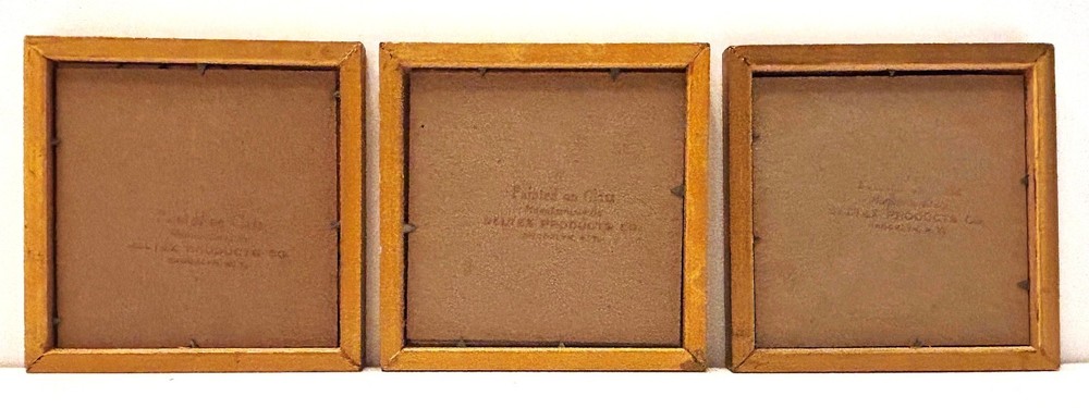 SET of (3) 1933 Hand-Painted Silhouette on Glass with Pebbled Gold Foil Background and Wood Frame made by Deltex Products Co., Brooklyn, N.Y. Depicts Victorian Couple on railing, carving hearts in a tree, and woman writing a love letter at a desk. All measure approximately 4-3/4” inches tall and 4-3/4” inches wide. I have an entire collection of silhouettes I'm listing and will combine shipping for multiple purchases and refund the difference. Please look at all of the pictures and ask questions prior to buying. I will only ship to the lower 48 states for the cost provided in the auction, but can ship to AK, and HI for shipping costs. If you live overseas, please take advantage of eBay’s Global Shipping program. Check out my other Silhouettes on my eBay store: https://www.ebay.com/str/nosmustangparts
