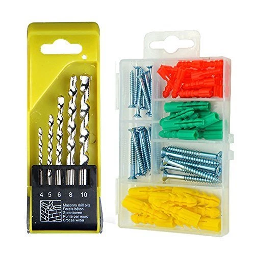 Concrete masonry drill bit set in plastic case, Carbide Tip Plastic anchors and screws come with 3 colors and 3 sizes, total arround 60pcs included Five sizes of drills: 5/32(4mm), 3/16(5mm), 15/64(6mm), 5/16(8mm), & 3/8"(10mm) Penetrate concrete, concrete blocks, brick, tile or stone with your power drill It is easy to let drill bits do a right work with correct drilling speed and torque setting Package:1X 5 pcs Masonry Brill Bit Set + 1 x Setscrews Set in Plastic Case
