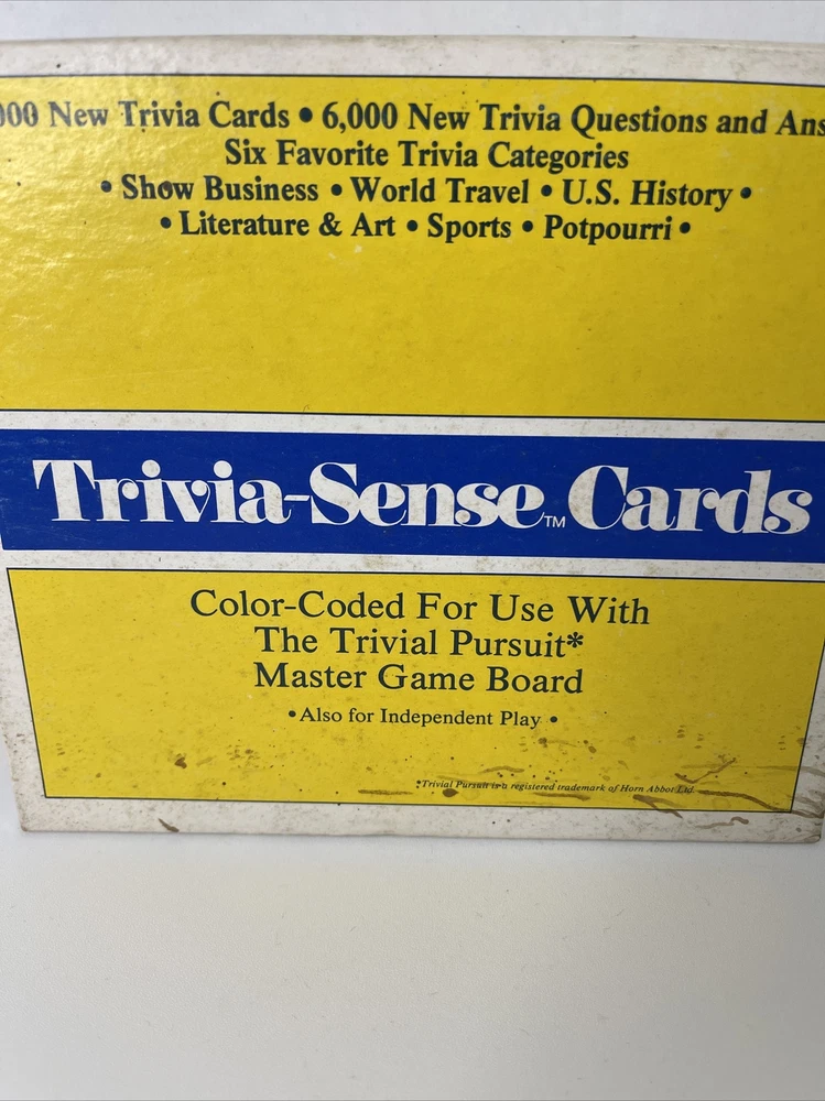 Modified Item:NoTitle:Trivial PursuitCustom Bundle:NoAge Level:8-11 Years, 12-16 Years, 17 Years & UpEstado del artículo:UsadoCategory 3:US HistoryCountry/Region of Manufacture:ChinaCategory 2:World Travel GeographyUPC:Does not applyGame Title:Trivial PursuitCategory 5:SportsBrand:Trivia-Sensegtin13:Does not applyMin. Number of Players:2 playersCategory 1:Show Business Entertainment Pop CultureGame Type:TriviaTheme:VariousAward:Games 100Category 4:Literature and ArtVintage (Yes/No):YesType:Cards