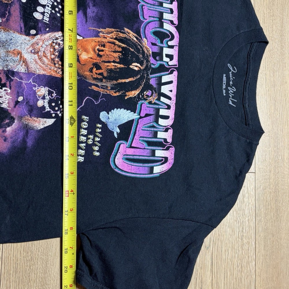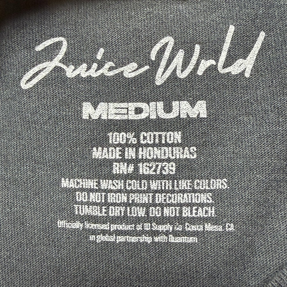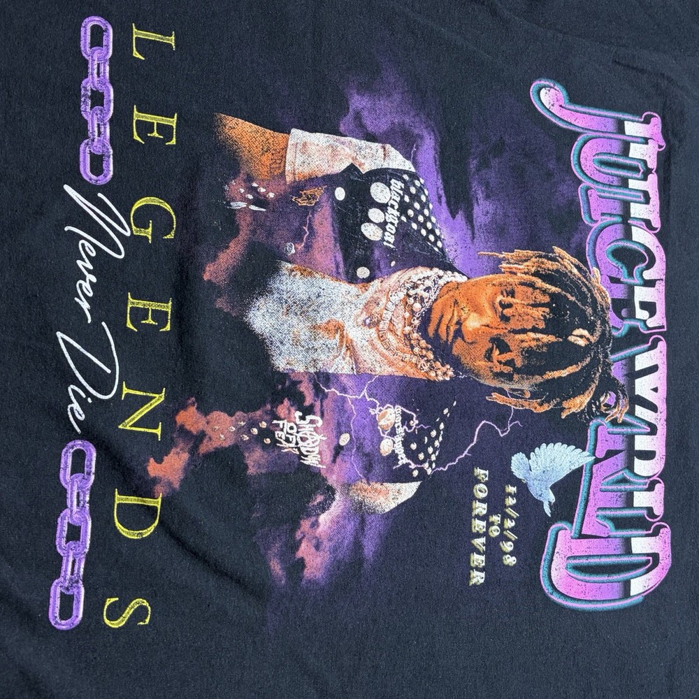 The Juice WRLD T-Shirt Legends Never Die RIP Tribute is a graphic tee featuring a crew neck and short sleeves, perfect for any hip hop or rap music fan. Made from black cotton with a logo accent, this regular fit shirt is machine washable and suitable for all seasons, including summer, fall, and spring. Showcasing the iconic Juice Wrld brand, this tribute shirt is a must-have for fans of the legendary rapper. Made in Honduras, this classic tee is a stylish and comfortable choice for men who appreciate music and streetwear fashion.