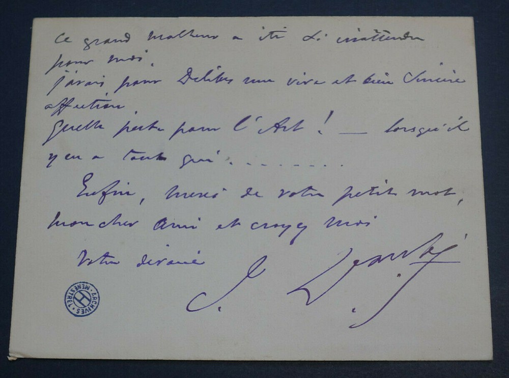 Jules DANBE. Lettre au format carte autographe signée à Henri HEUGEL. Paris, le 27 janvier 1891. Carte avec entête du Théâtre National de l'Opéra-Comique. Dimensions : 13.8 x 10,7 cm. 2 pages. Etat : Bel état de conservation, voir photos pour plus de détails. Envoi soigné dans un emballage rigide et étanche. Satisfait ou remboursé. Si vous n'êtes pas entièrement satisfait, je reprends la marchandise avec retour à ma charge pour l'Europe et à la charge de l'acheteur pour le reste du monde. N’hésitez pas à visiter ma boutique et affiner vos recherches en fonction des catégories qui vous intéressent. Ma boutique L'Art Délivré. Lettres autographes, vieux papiers, livres anciens, photographies, gravures, timbres… Nous expertisons et/ou rachetons dans toute la France vos lettres, collections de lettres et livres anciens. Merci de votre visite. Jérôme KAYSER. Jules DANBE. Lettre au format carte autographe signée à Henri HEUGEL. Paris, le 27 janvier 1891. Carte avec entête du Théâtre National de l'Opéra-Comique. Dimensions : 13.8 x 10,7 cm. 2 pages. Etat : Bel état de conservation, voir photos pour plus de détails. Envoi soigné dans un emballage rigide et étanche. Satisfait ou remboursé. Si vous n'êtes pas entièrement satisfait, je reprends la marchandise avec retour à ma charge pour l'Europe et à la charge de l'acheteur pour le reste du monde. N’hésitez pas à visiter ma boutique et affiner vos recherches en fonction des catégories qui vous intéressent. Ma boutique Lettres autographes, vieux papiers, livres anciens, photographies, gravures, timbres… Nous expertisons et/ou rachetons dans toute la France vos lettres, collections de lettres et liv