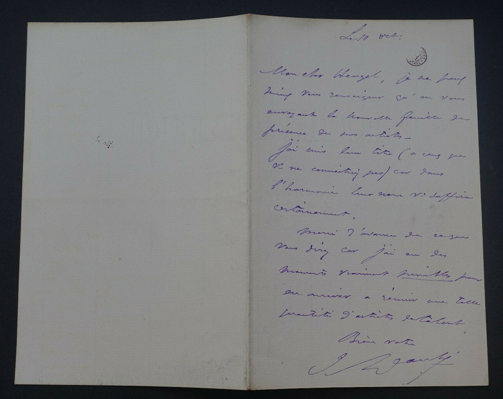 Jules DANBE. Lettre autographe signée à Heugel. Dimensions : 11,1 x 17,5 cm. 1 page. Etat : Bel état de conservation, voir photos pour plus de détails. Envoi soigné dans un emballage rigide et étanche. Satisfait ou remboursé. Si vous n'êtes pas entièrement satisfait, je reprends la marchandise avec retour à ma charge pour l'Europe et à la charge de l'acheteur pour le reste du monde. N’hésitez pas à visiter ma boutique et affiner vos recherches en fonction des catégories qui vous intéressent. Ma boutique L'Art Délivré. Lettres autographes, vieux papiers, livres anciens, photographies, gravures, timbres… Nous expertisons et/ou rachetons dans toute la France vos lettres, collections de lettres et livres anciens. Merci de votre visite. Jérôme KAYSER. Jules DANBE. Lettre autographe signée à Heugel. Dimensions : 11,1 x 17,5 cm. 1 page. Etat : Bel état de conservation, voir photos pour plus de détails. Envoi soigné dans un emballage rigide et étanche. Satisfait ou remboursé. Si vous n'êtes pas entièrement satisfait, je reprends la marchandise avec retour à ma charge pour l'Europe et à la charge de l'acheteur pour le reste du monde. N’hésitez pas à visiter ma boutique et affiner vos recherches en fonction des catégories qui vous intéressent. Ma boutique L'Art Délivré. Lettres autographes, vieux papiers, livres anciens, photographies, gravures, timbres… Nous expertisons et/ou rachetons dans toute la France vos lettres, collections de lettres et livres anciens. Merci de votre visite. Jérôme KAYSER.
