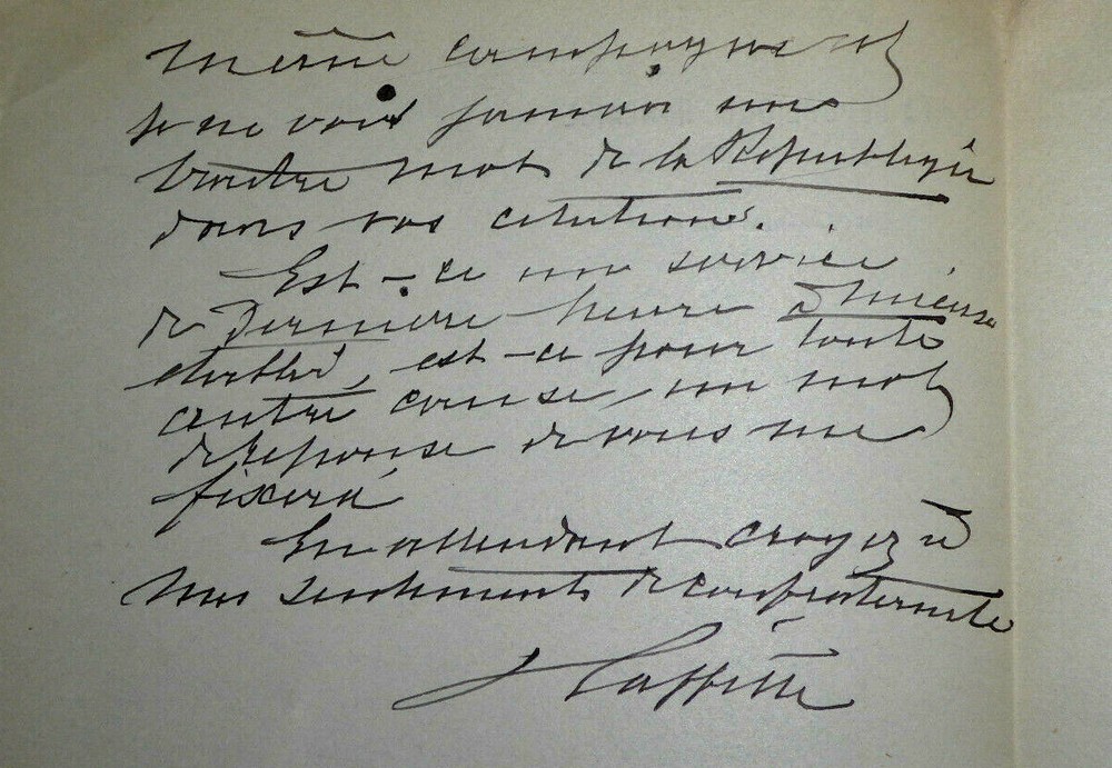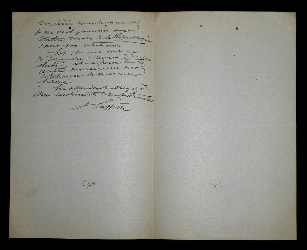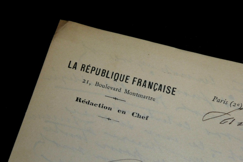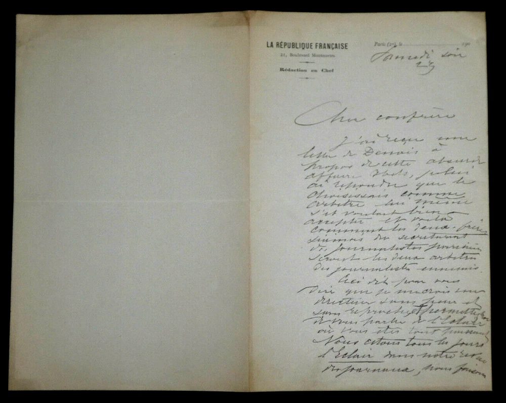 Jules LAFFITTE . Lettre autographe signée. Paris. Papier avec entête "La République Française", Rédacteur en chef . Dimensions : 13,5 x 21,5 cm. 2 pages. État : Bon état . Voir photos. Jules Laffitte, né le 16 mai 1838 à Bercy et mort le 14 mars 1904 à Chatou, est un journaliste français. Wikipédia Envoi soigné dans un emballage rigide et étanche. N’hésitez pas à visiter ma boutique et affiner vos recherches en fonction des catégories qui vous intéressent. Ma boutique L'Art Délivré. Lettres autographes, vieux papiers, livres anciens, photographies, gravures, timbres… Nous expertisons et/ou rachetons dans toute la France vos lettres, collections de lettres et livres anciens. Merci de votre visite. Jérôme KAYSER. Jules LAFFITTE. Lettre autographe signée. Paris. Papier avec entête "La République Française", Rédacteur en chef. Dimensions : 13,5 x 21,5 cm. 2 pages. État : Bon état. Voir photos. Jules Laffitte, né le 16 mai 1838 à Bercy et mort le 14 mars 1904 à Chatou, est un journaliste français. Wikipédia Envoi soigné dans un emballage rigide et étanche. N’hésitez pas à visiter ma boutique et affiner vos recherches en fonction des catégories qui vous intéressent. Ma boutique L'Art Délivré. Lettres autographes, vieux papiers, livres anciens, photographies, gravures, timbres… Nous expertisons et/ou rachetons dans toute la France vos lettres, collections de lettres et livres anciens. Merci de votre visite. Jérôme KAYSER.